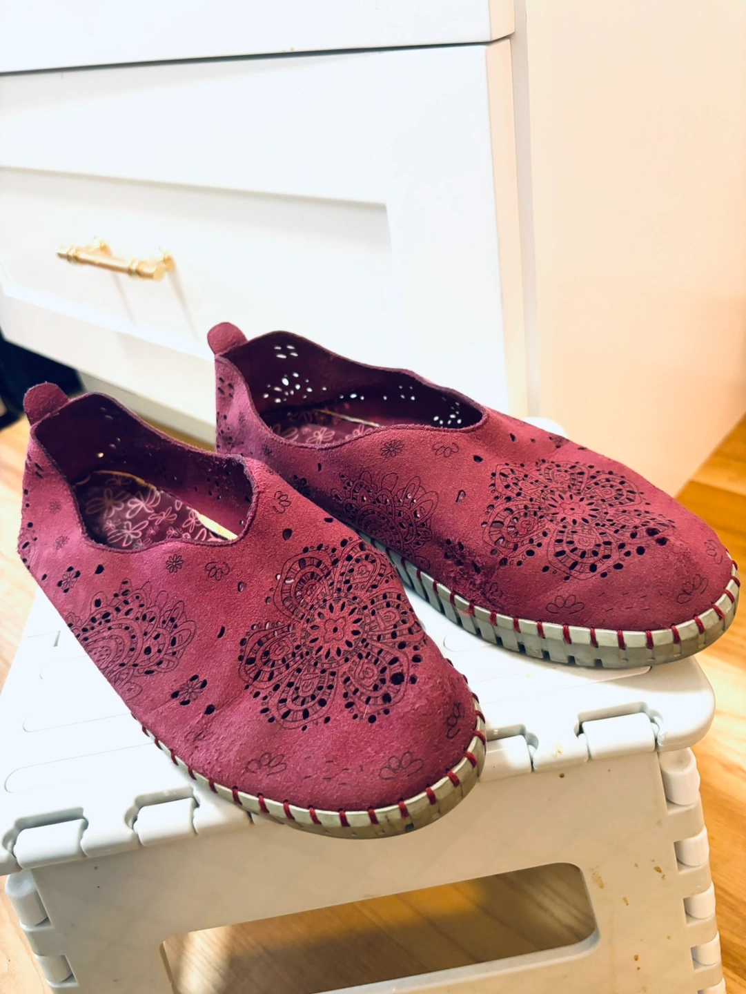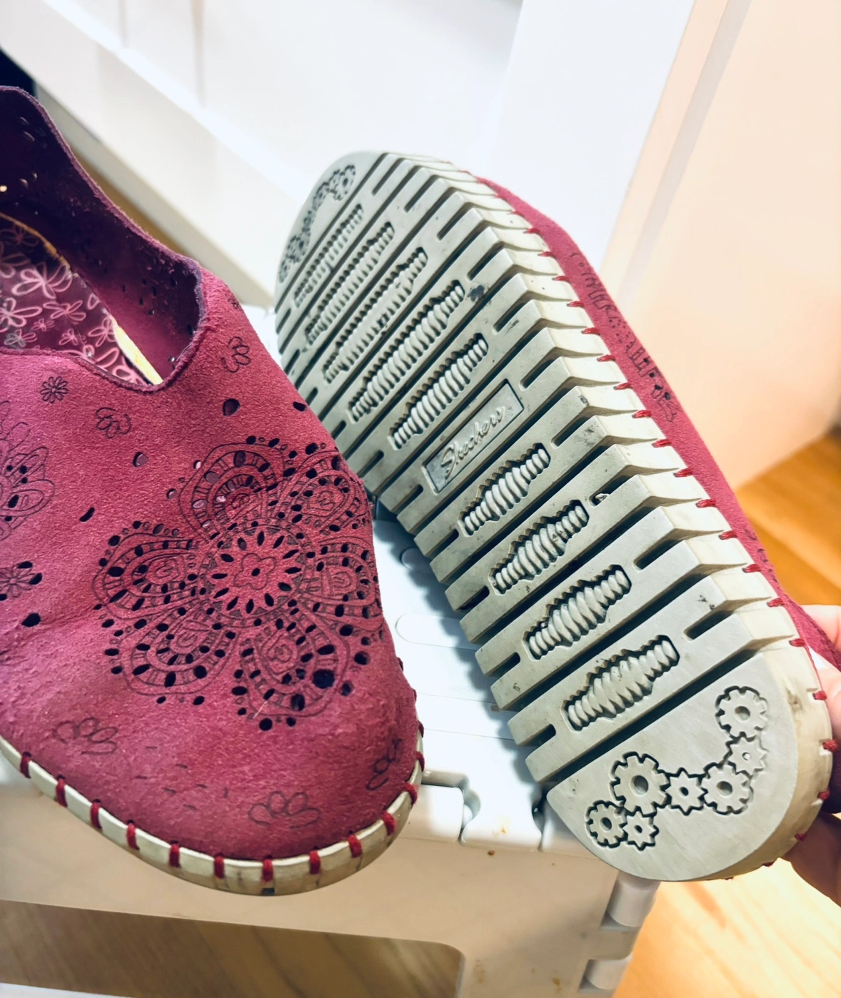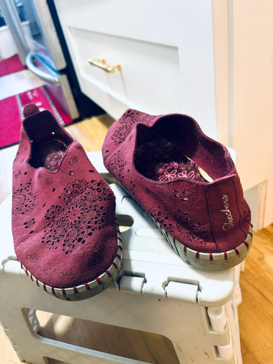 Women's slip-on shoes from Skechers. Red suede with floral design. Size 8.5M