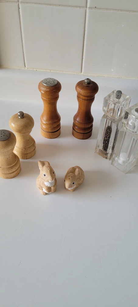Set of six salt and pepper shakers. There are four wooden shakers, a set of glass shakers, and a pair of ceramic bunny shakers. Any set $5 each set.