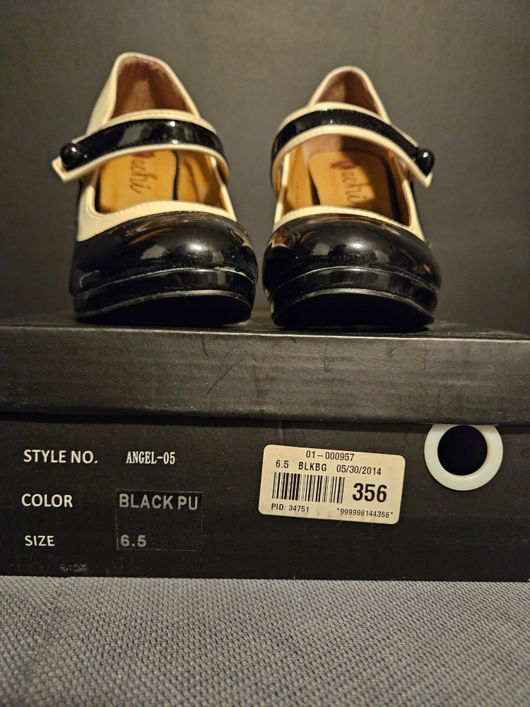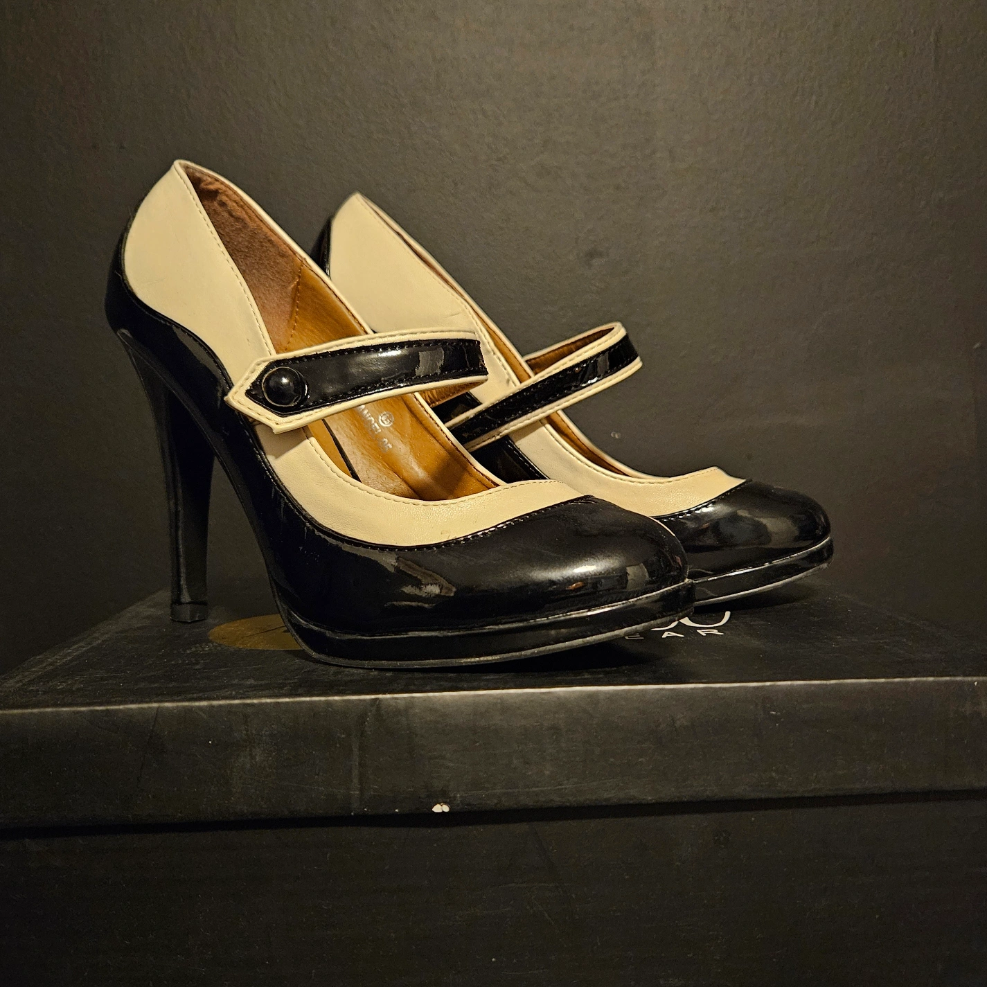 These are black and Cream heeled shoes. They have a strap across the top. Only worn for a couple of photo shoots, but have a few scuffs from being jostled in the box over the years.