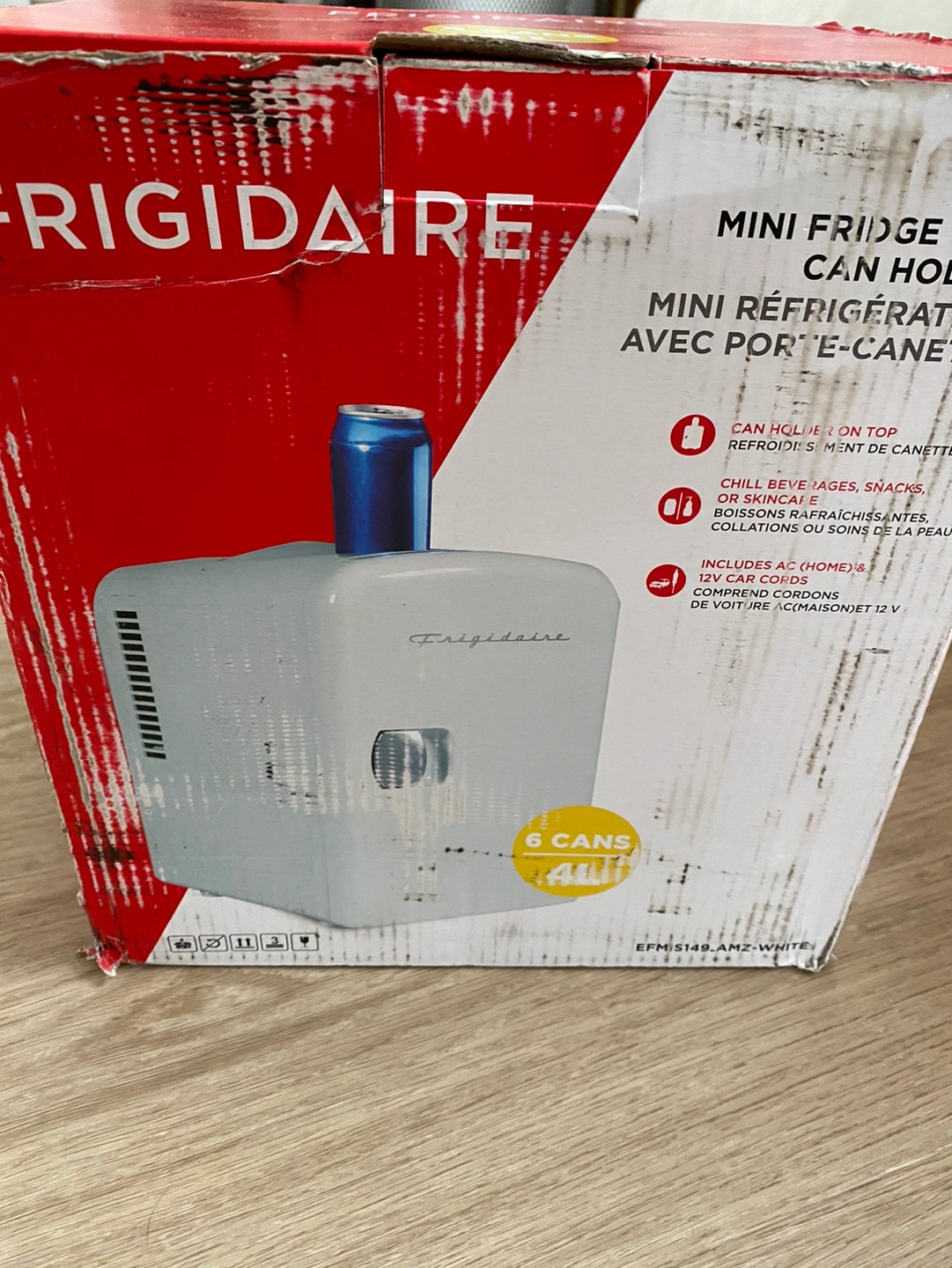 White mini fridge with can holder. Includes AC and DC power cords. Holds 6 cans and has a 4L capacity. It is compact and perfect for a dorm room or office.