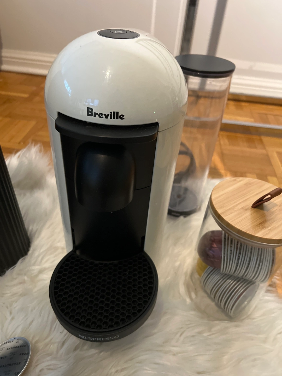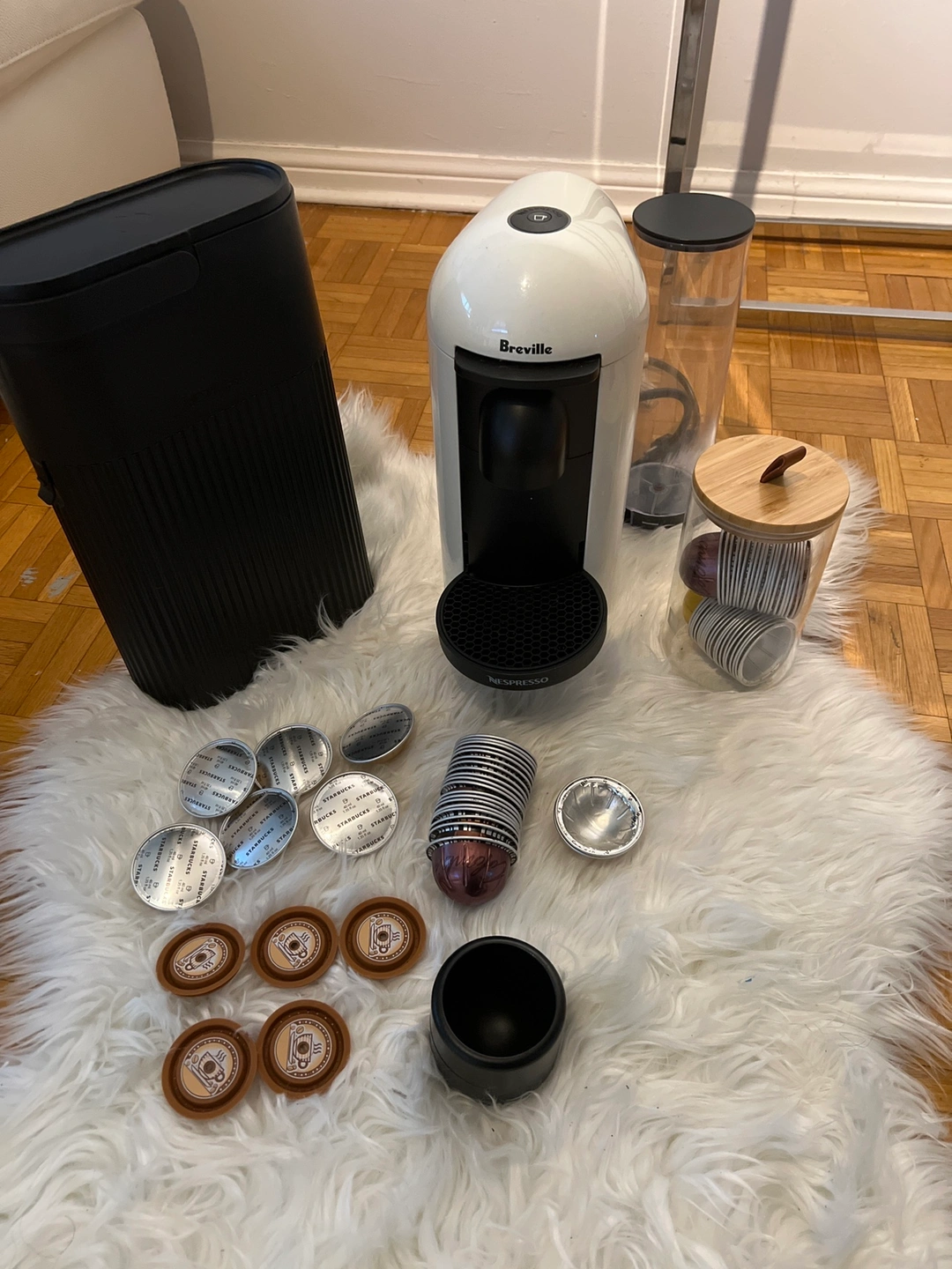 Breville Nespresso machine with accessories. It includes a glass capsule holder, a black capsule recycle bin and other accessories.