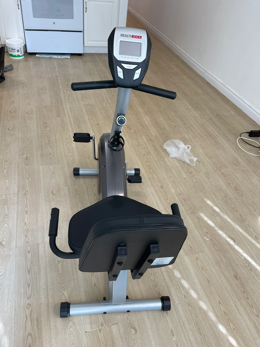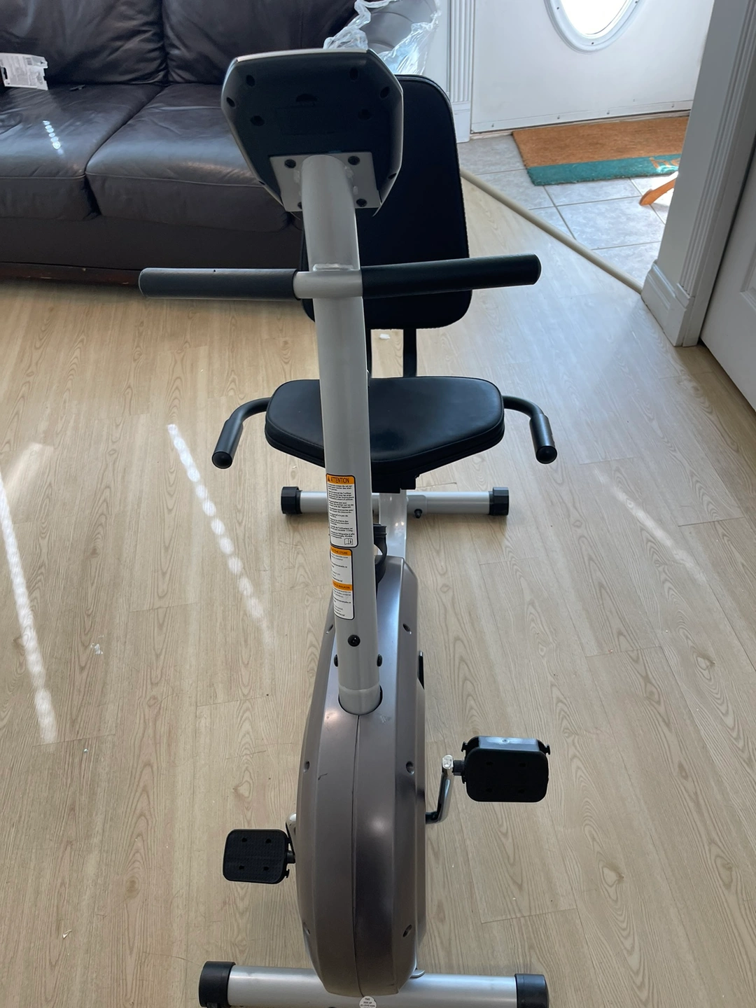The bike is in good condition, with a few minor scratches. It has an adjustable seat and backrest, as well as a digital monitor that tracks time, distance, calories burned, and speed. It comes with a water bottle holder.