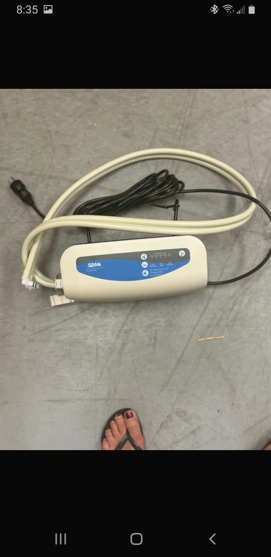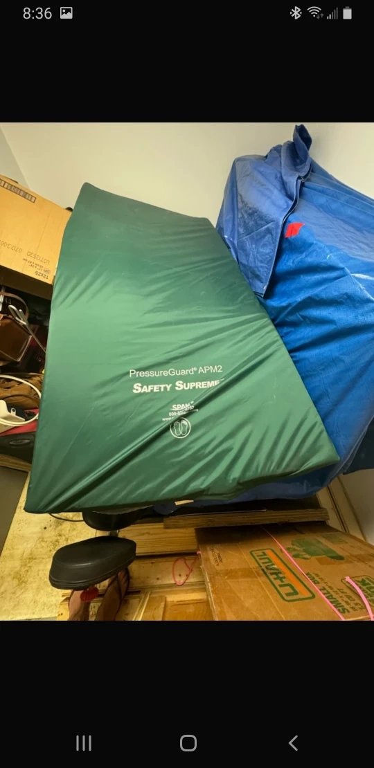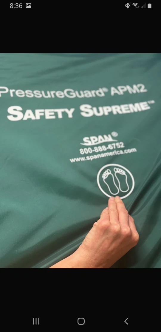 This is a Brand new Span PressureGuard APM2 Safety Supreme Mattress with the control unit. It is green and has a white label that says "PressureGuard APM2 Safety Supreme". The mattress is made by Span. The control unit is white and has the Span logo on it.
