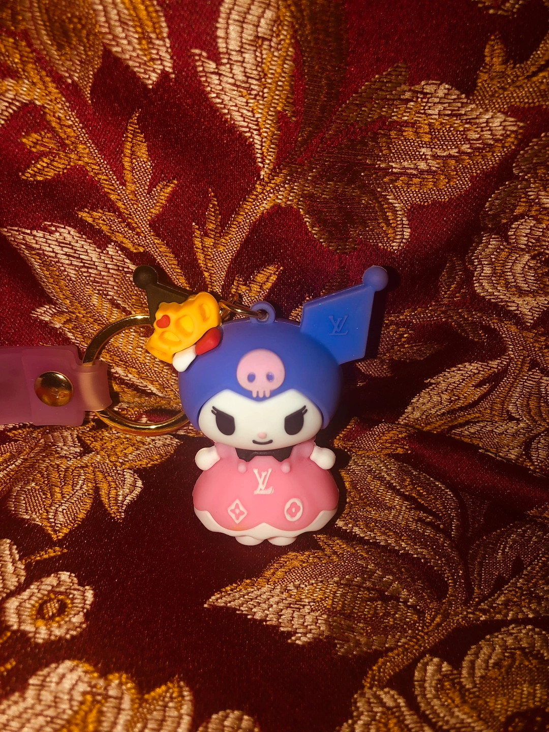 This is a keychain featuring the character Kuromi. The keychain has a purple and pink color scheme, and it is attached to a gold chain.