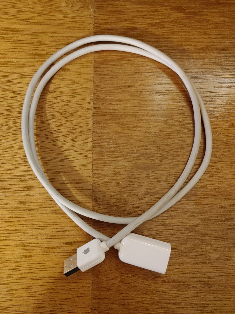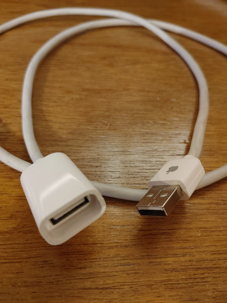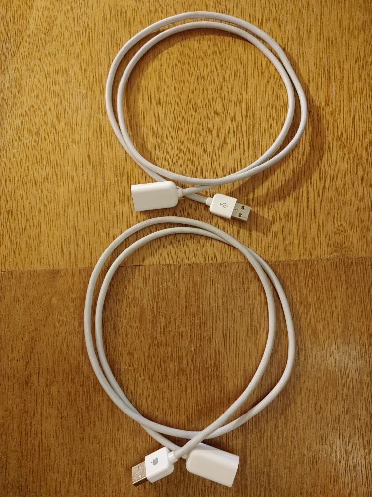 Two Apple USB extension cables. Each cable is approximately 1 metre long. Both cables are male to female.