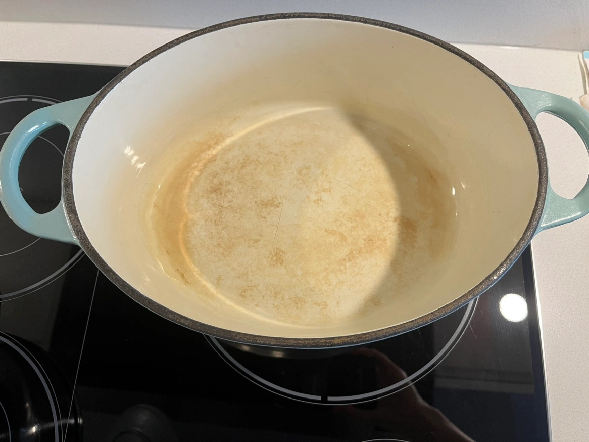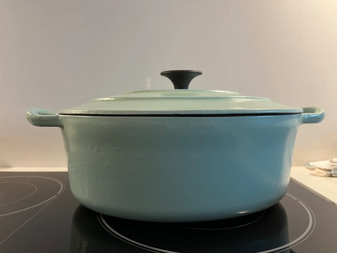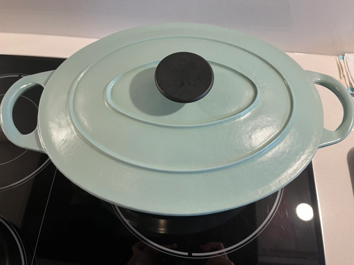 This is a beautiful blue cast iron Dutch oven. It comes with a lid and is perfect for making soups, stews, and other dishes.