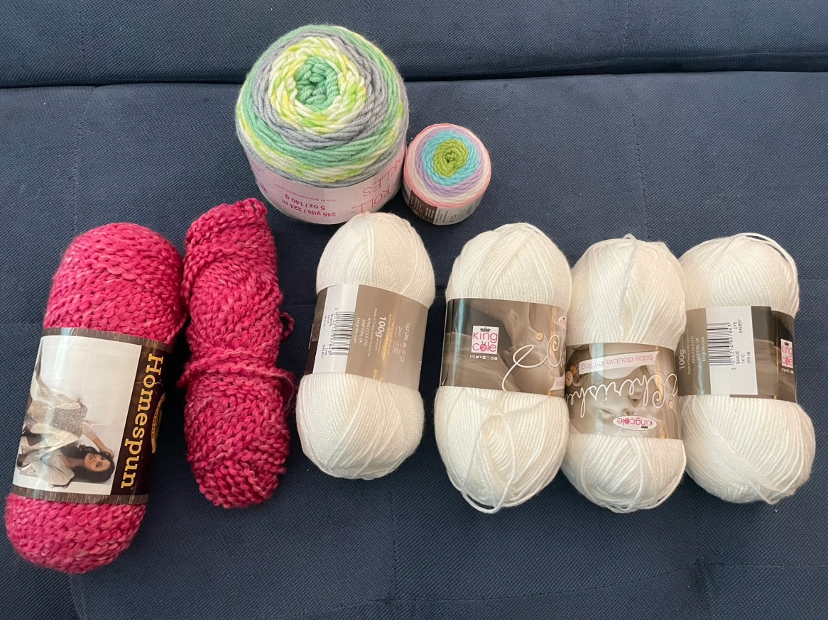 A bundle of yarn including one full ball and partial ball of Lion Brand Homespun, four balls of King Cole Cherish DK yarn, and 2 cake yarns.
