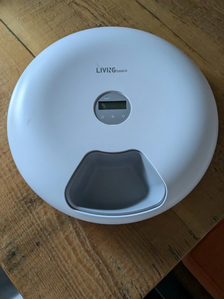 This automatic pet feeder is a great way to ensure your pet is fed on time, even when you're not home. It has six compartments for different types of food and can be programmed to dispense food at specific times. Power cord included. Can be powered by batteries if there is a power outage.