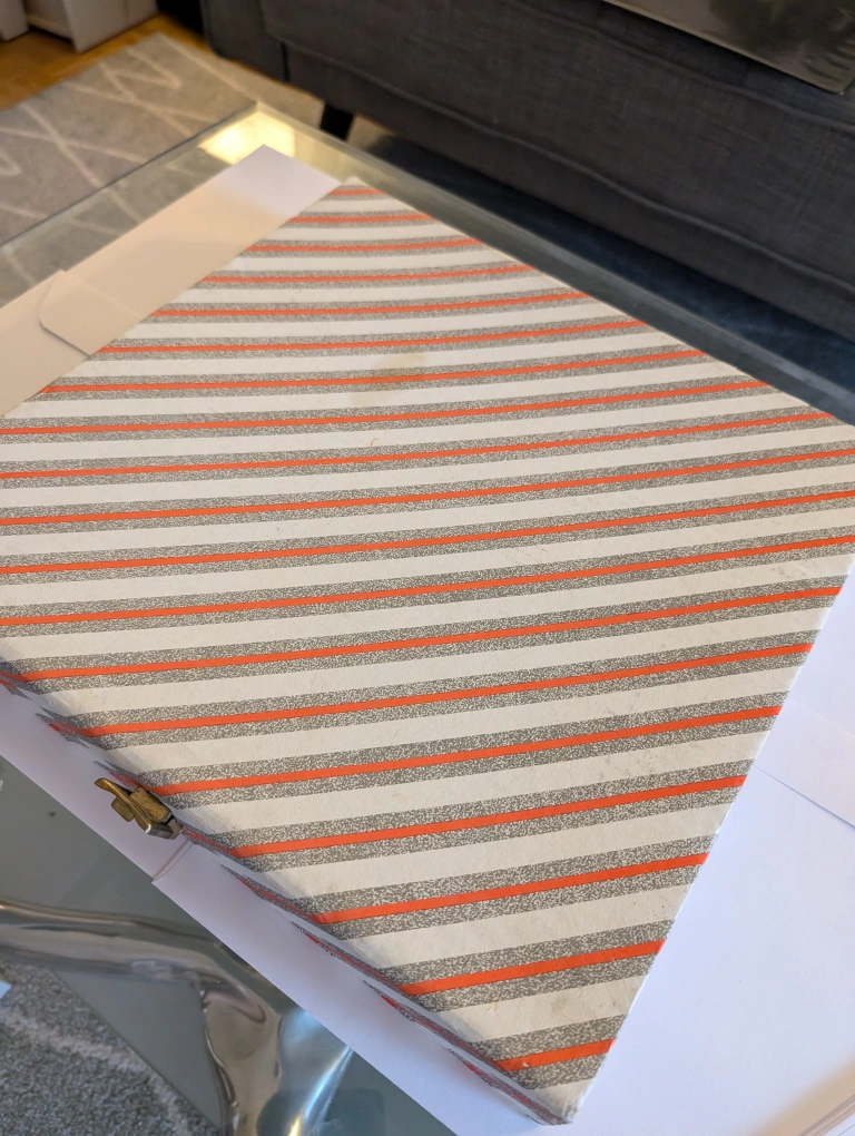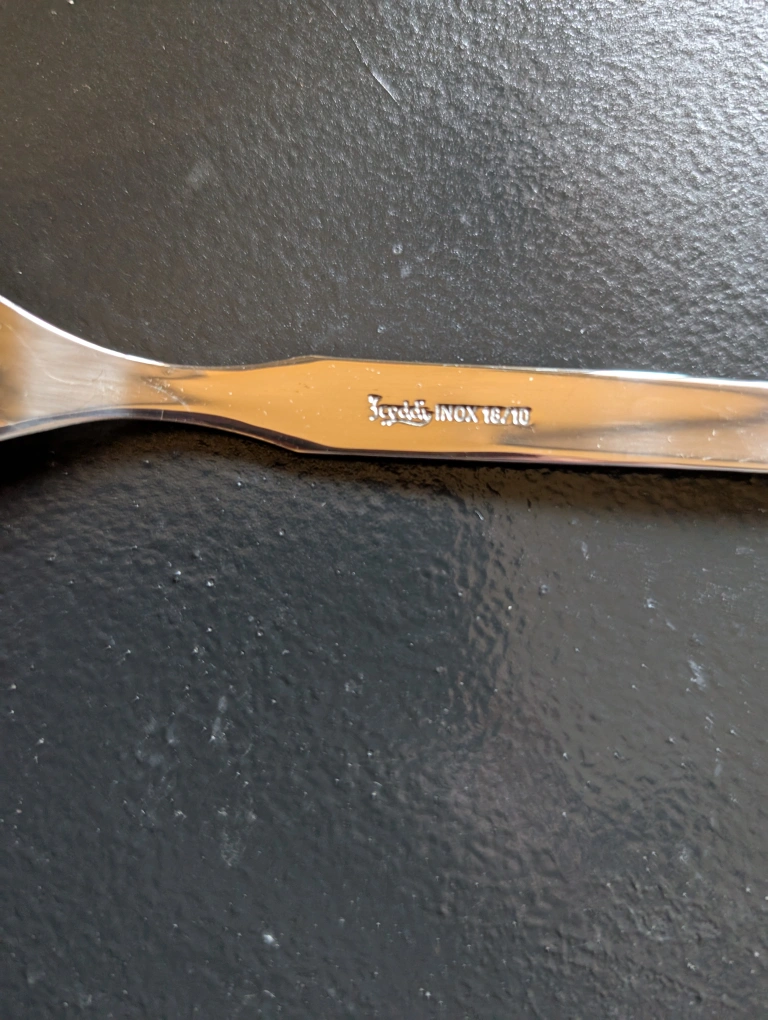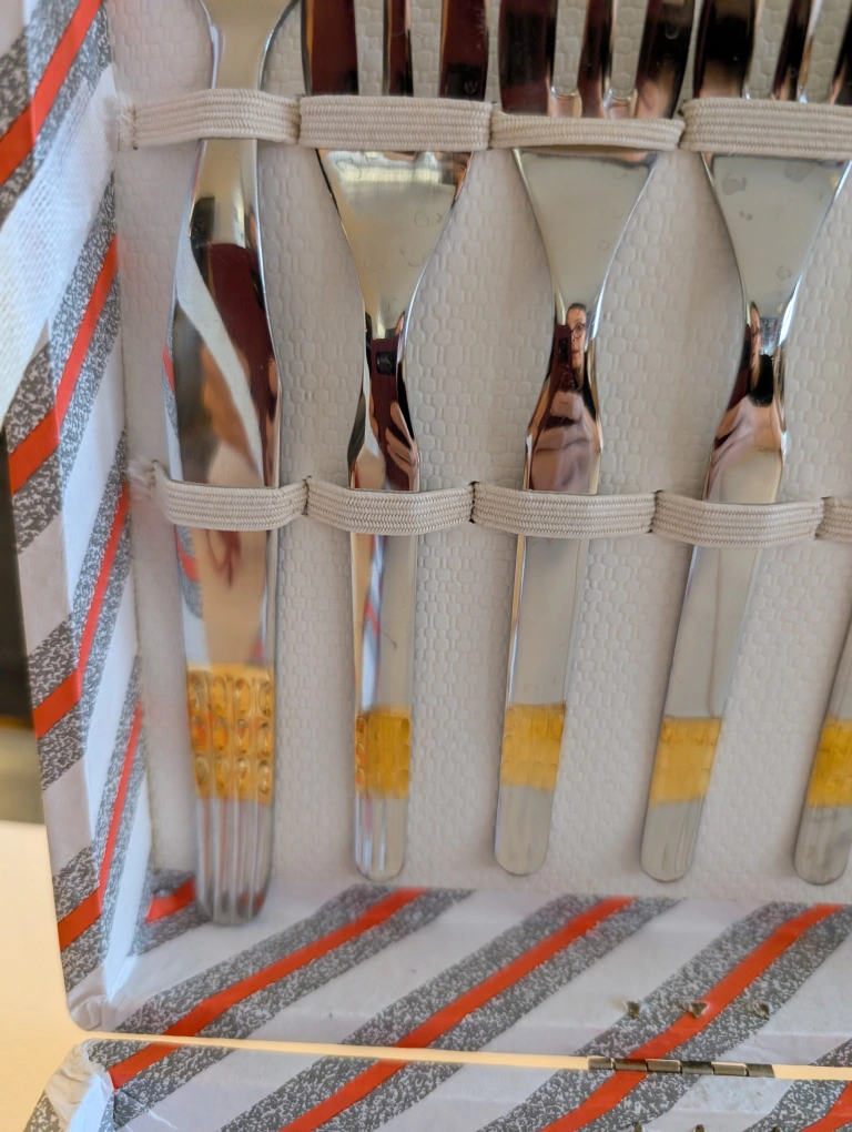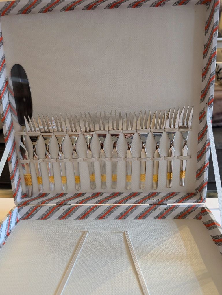 This set of silverware includes 12 forks and 1 serving spoon. The silverware comes in a vintage box with a striped pattern. The silverware is made of stainless steel and is marked "Inox 18/10".