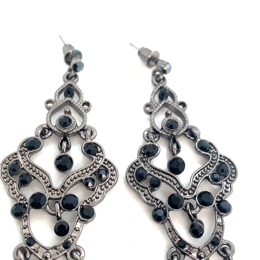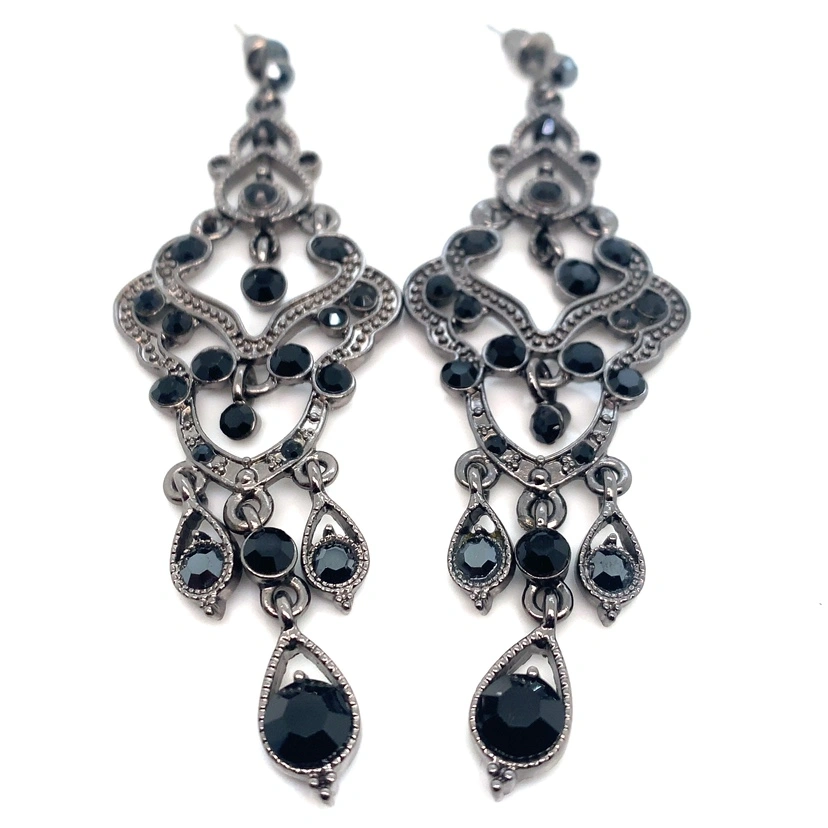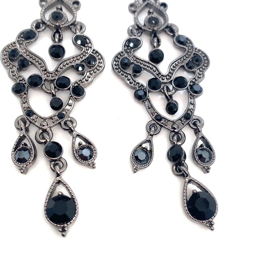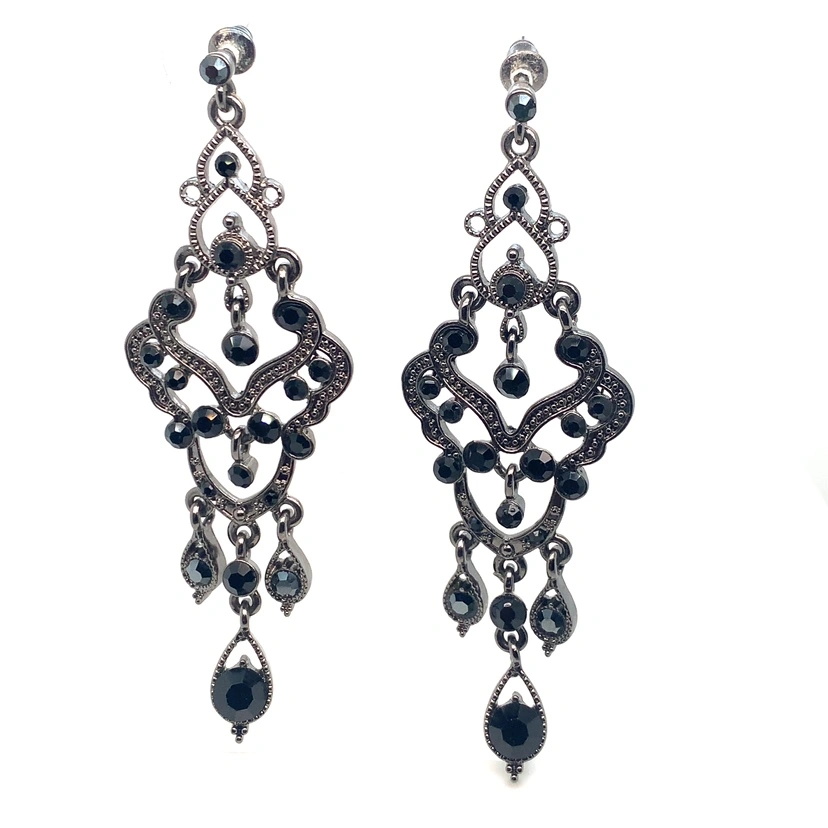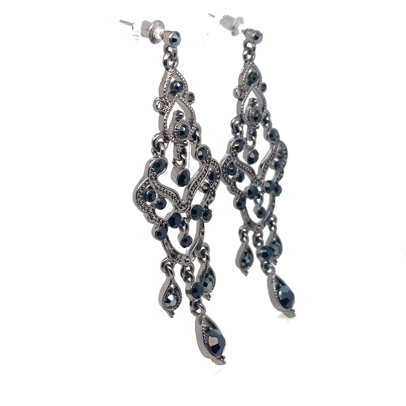 Elegant chandelier earrings featuring black crystals and Marcasite with a gunmetal finish.