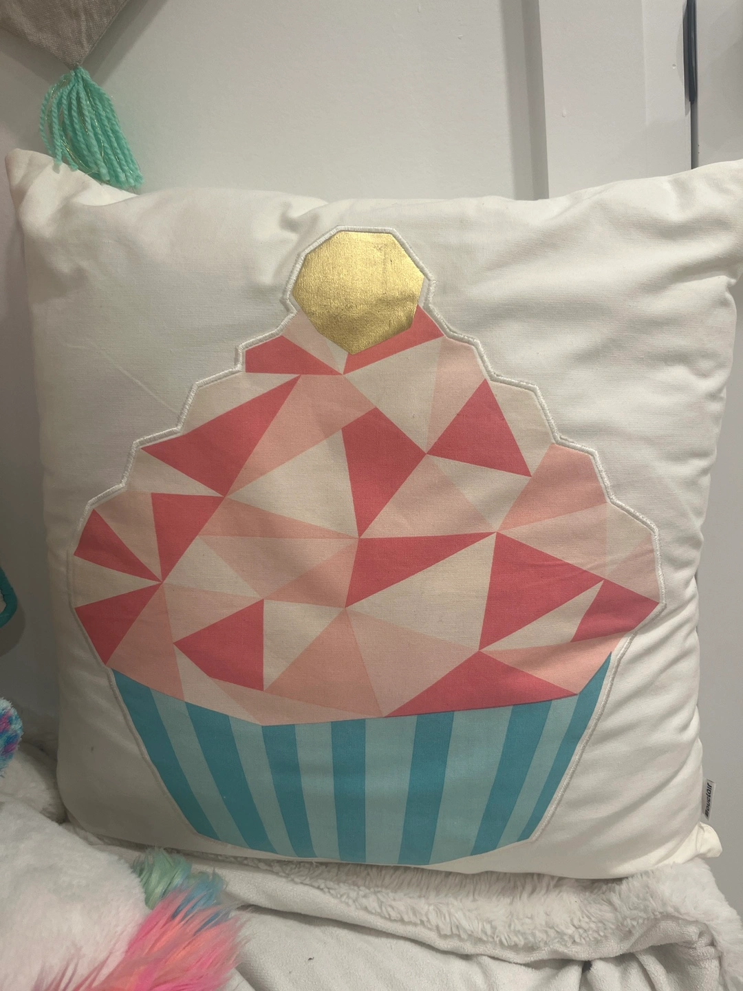 This is a white square pillow with an embroidered geometric cupcake on the front. The cupcake is pink and has a gold topper. The cupcake is on a blue and white striped liner.