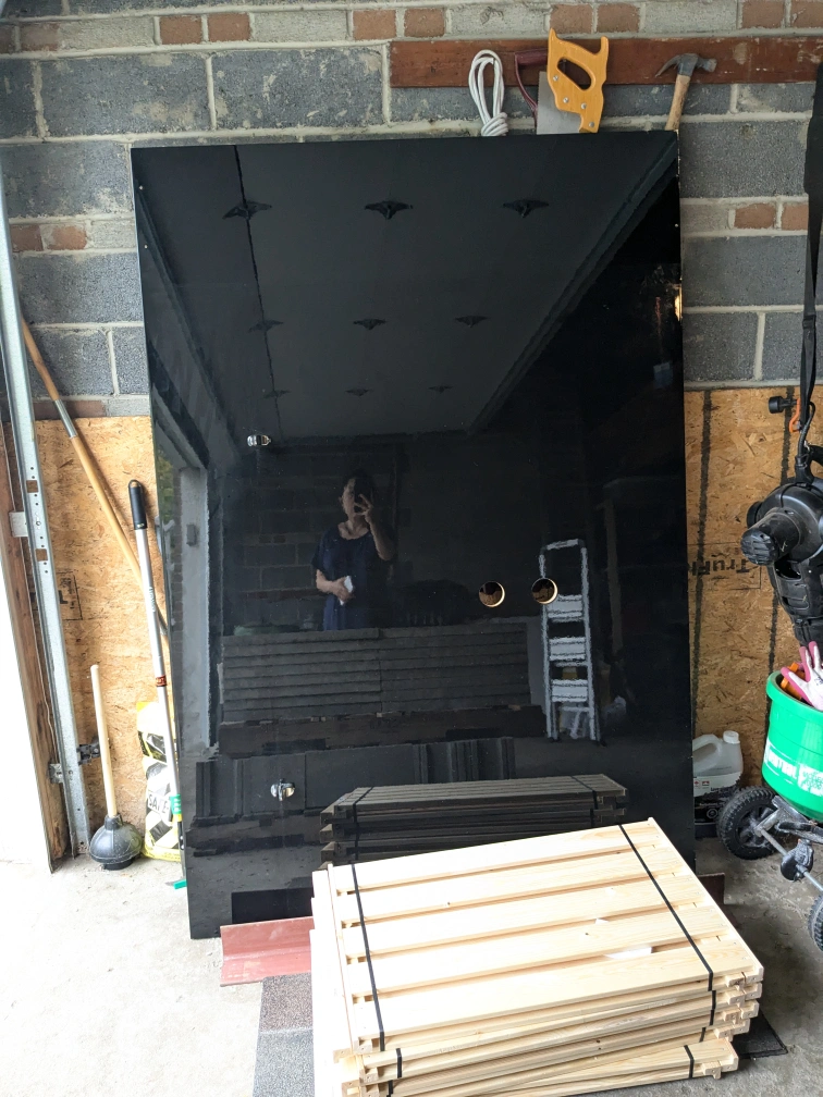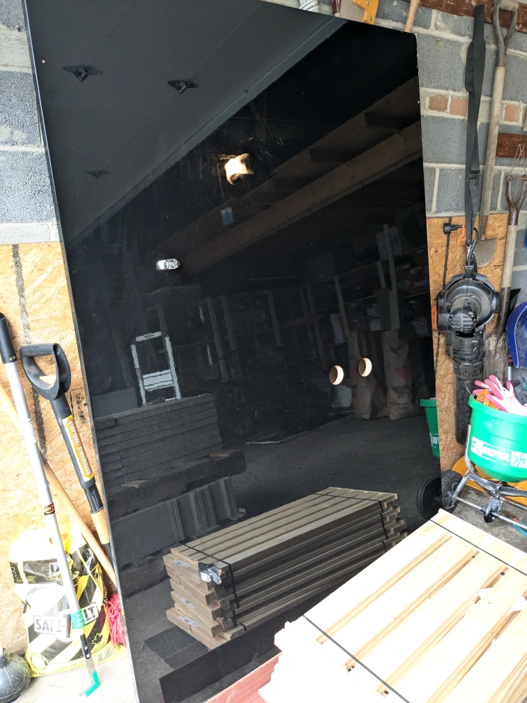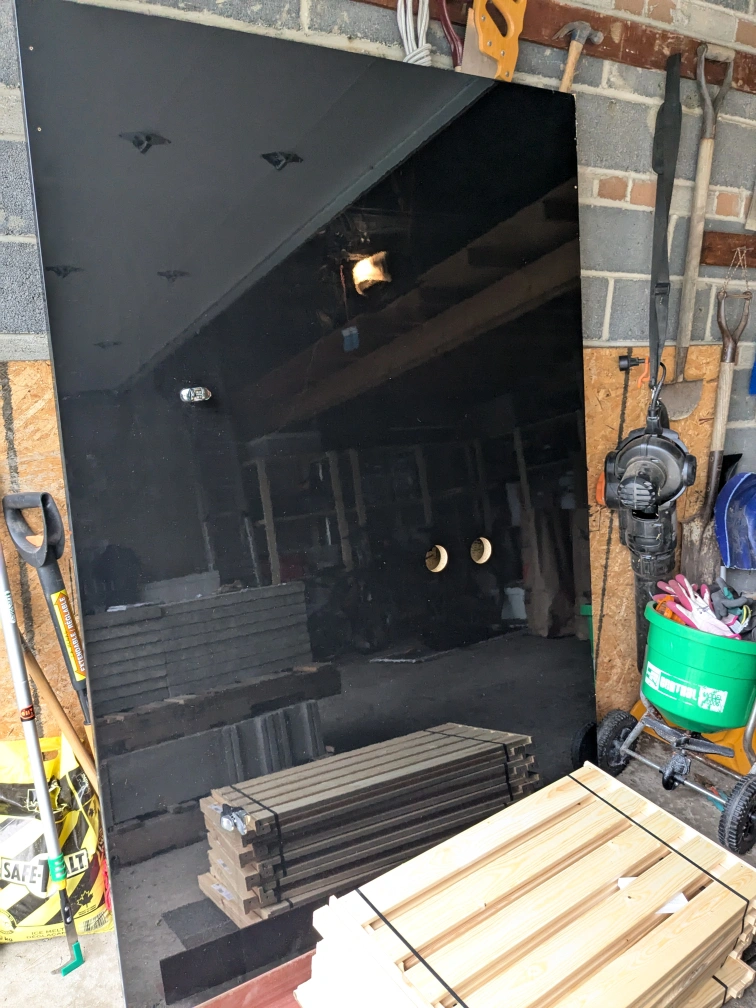 A piece of very large renovation material, wood probably, but glossy glassy surface. Has two cut holes and two bathroom vanity hardware pieces on it. We bought the house and it's left in the garage from previous owner. We think it's a leftover bathroom countertoo.