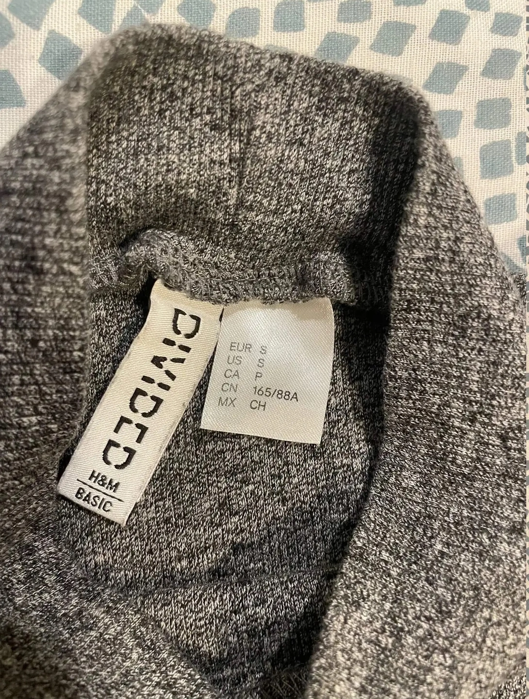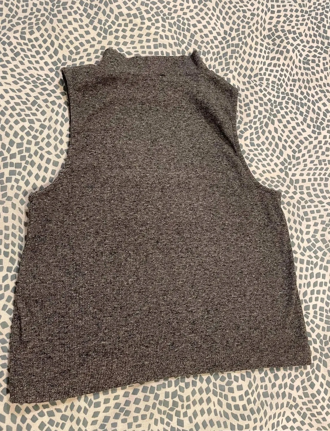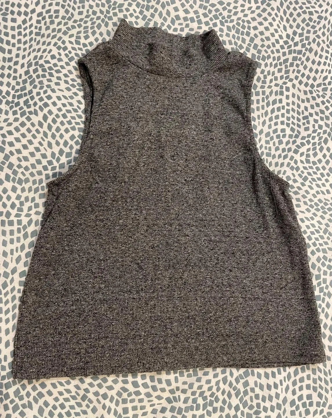 55A sleeveless mock neck top in a grey colour. It is made of a soft, stretchy material. The top has a fitted silhouette. It would be great to pair with jeans or a skirt. The top is in size Small, from H&M. It is a basic piece that can be dressed up or down.