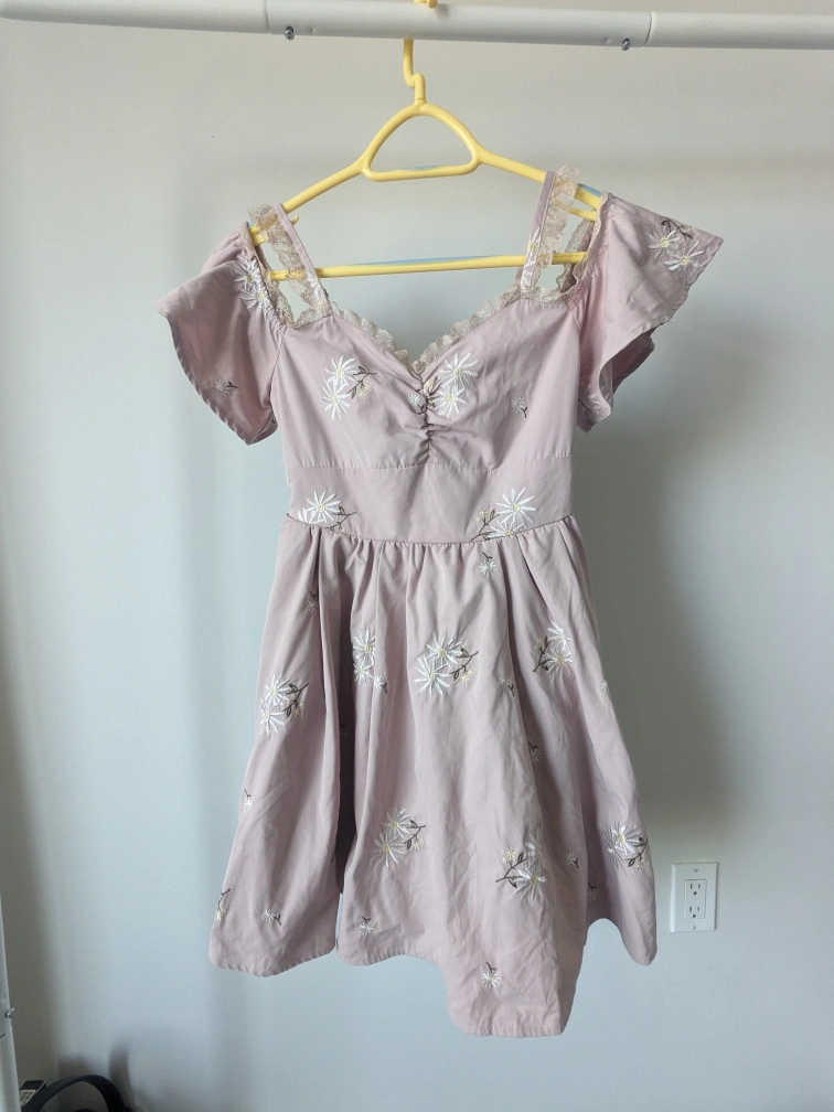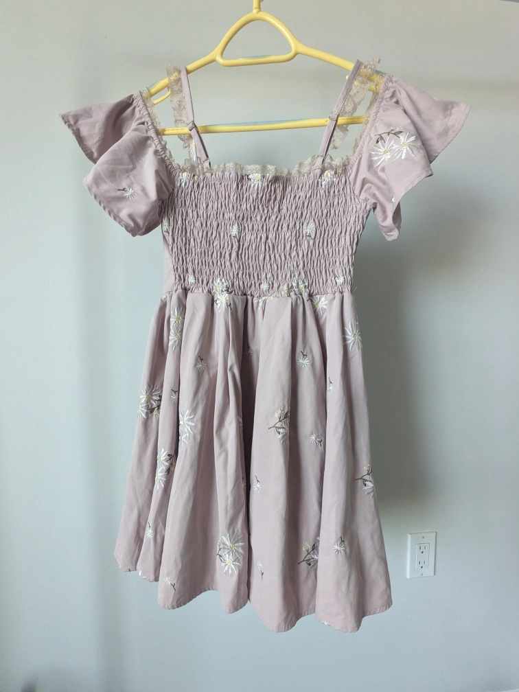 This lavender dress has thin, adjustable straps with a small ruffle and off shoulder flutter sleeves. There is an all-over daisy embroidery design - some in bunches of two and others solo of varying sizes.