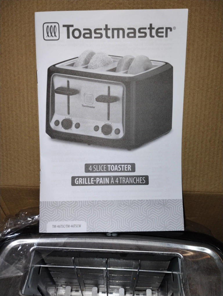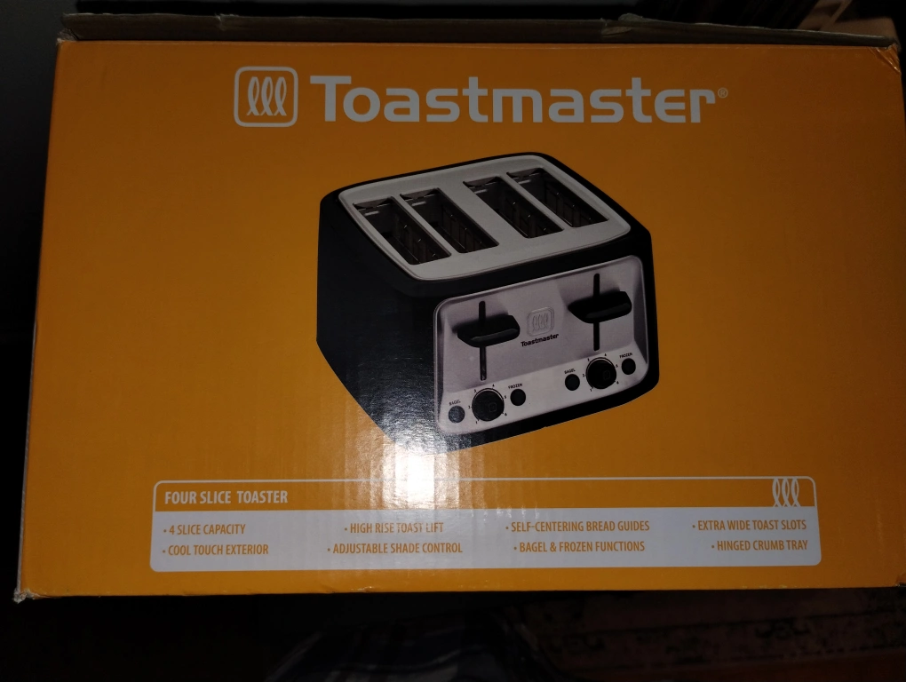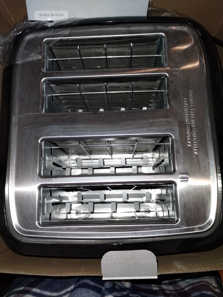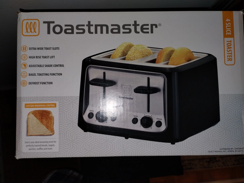 Black four-slice toaster with extra-wide toast slots, high rise toast lift, adjustable shade control, bagel toasting function, defrost function, custom browning control, self-centering bread guides, and a hinged crumb tray.