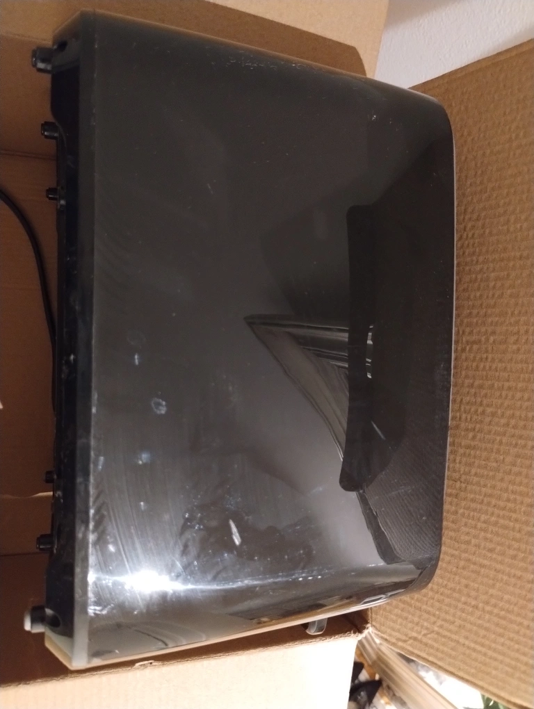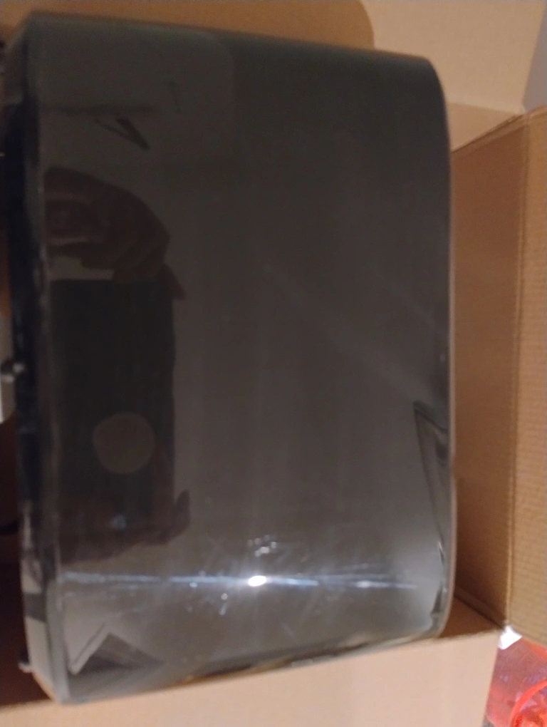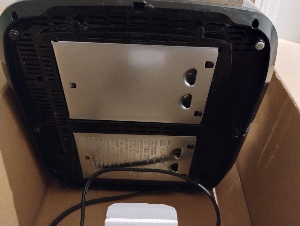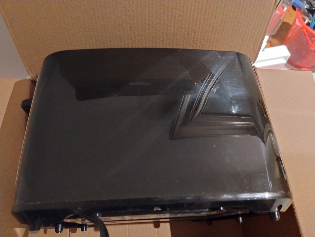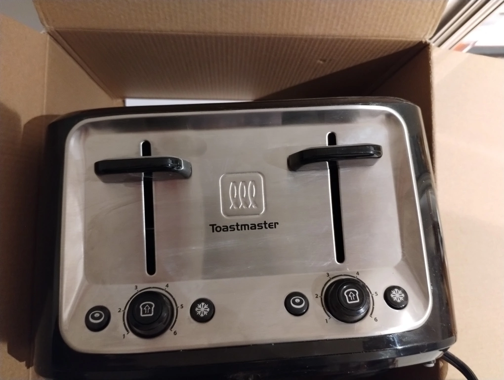 Black four-slice toaster with extra-wide toast slots, high rise toast lift, adjustable shade control, bagel toasting function, defrost function, custom browning control, self-centering bread guides, and a hinged crumb tray.