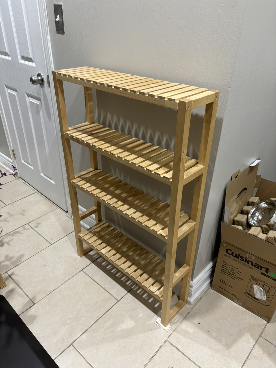 Four-tiered wooden shelving unit. Excellent for storage and organization. Has been used as extra pantry storage in the kitchen.
