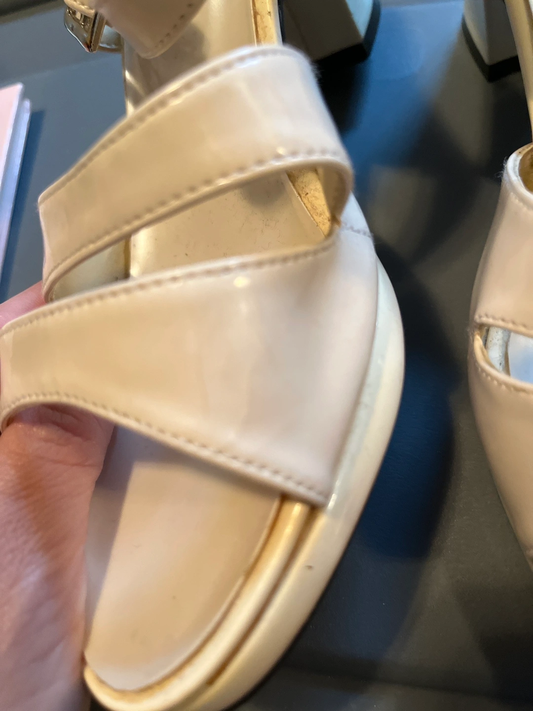 Cream coloured Kobo sandals with a platform heel. Bought them a while back , worn on special occasions. Signs of wearing ( last photo). Still have some life left. Smoke free and pets free home.