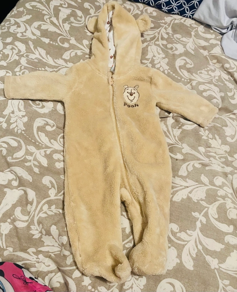 A beige Winnie the Pooh baby sleeper with a hood and bear ears. It has a front zipper closure and features a Winnie the Pooh appliqué on the front.