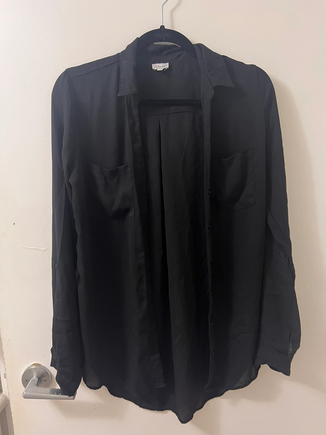 Long black sleeve button up shirt with a collar. It has two chest pockets and roll up sleeves with buttons!