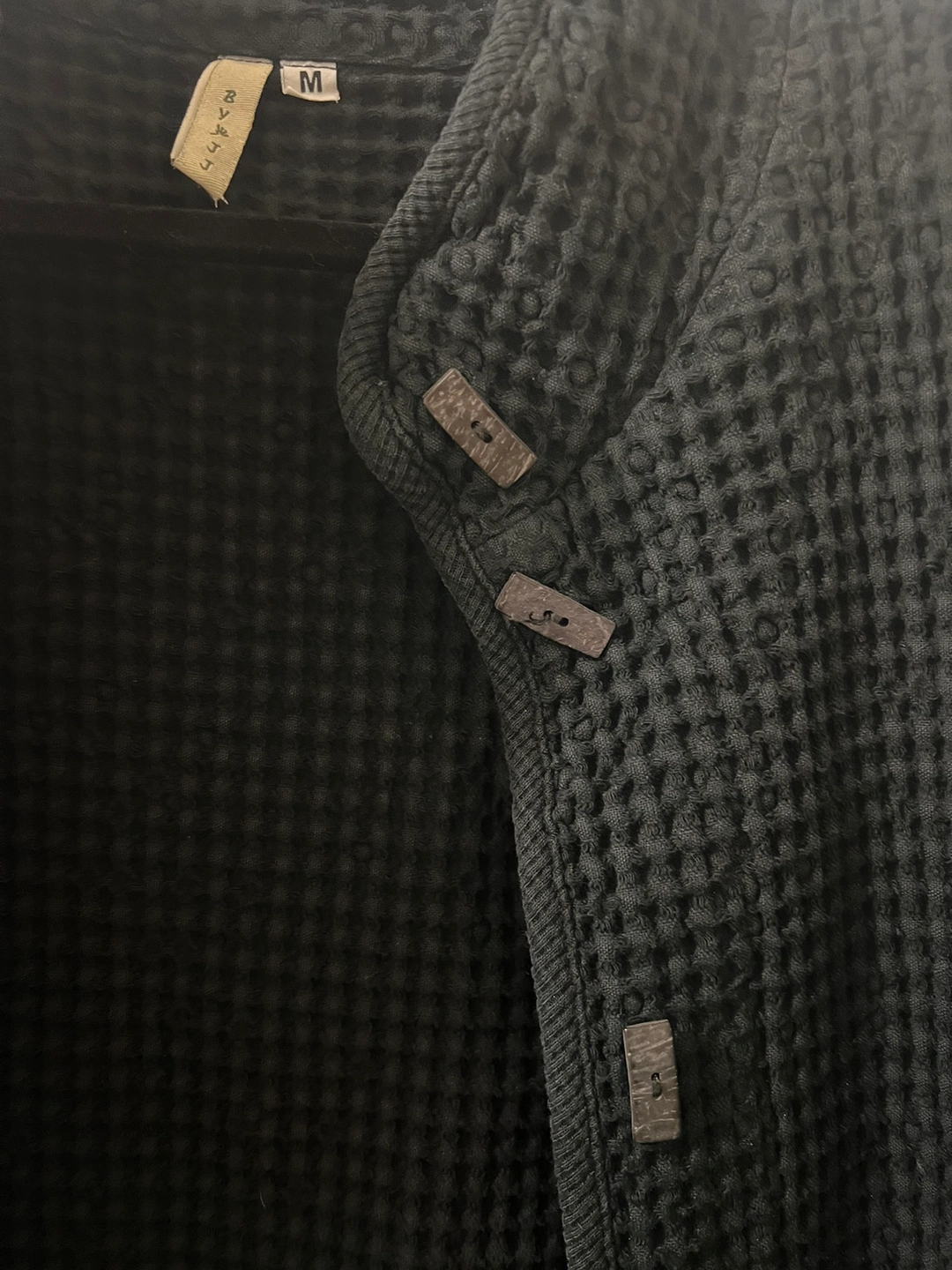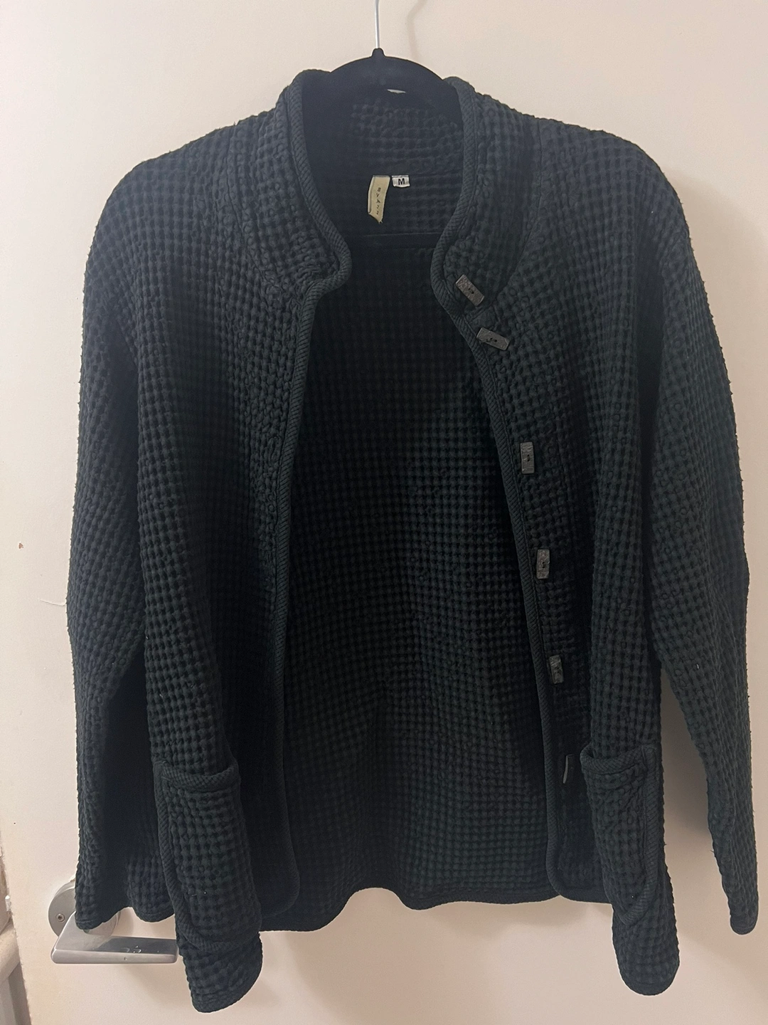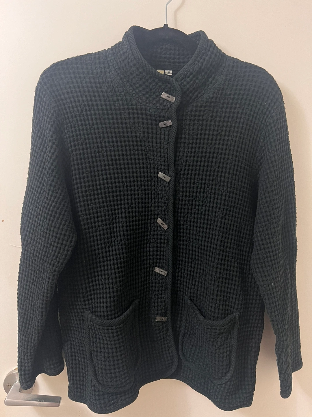 Size Medium, black waffle knit jacket with pockets and button closure.