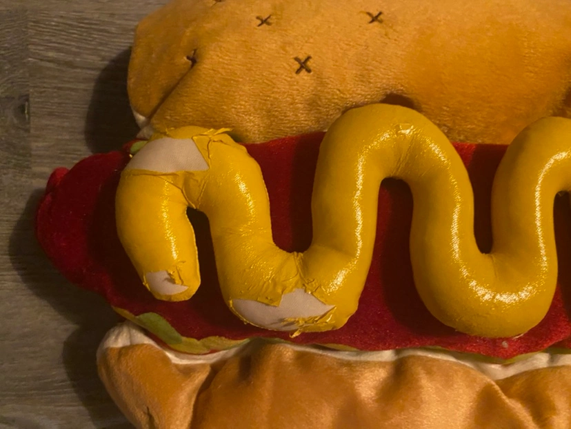 From Target, good used condition hotdog pet costume ๐ญ There is some wear on the mustard (the yellow is peeling off) and some catches on the inside of the costume from the Velcro straps rubbing, but it is otherwise fully intact and looks great, size โmediumโ. Was worn by my Boston Terrier for reference. Has been washed.