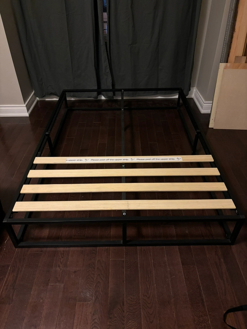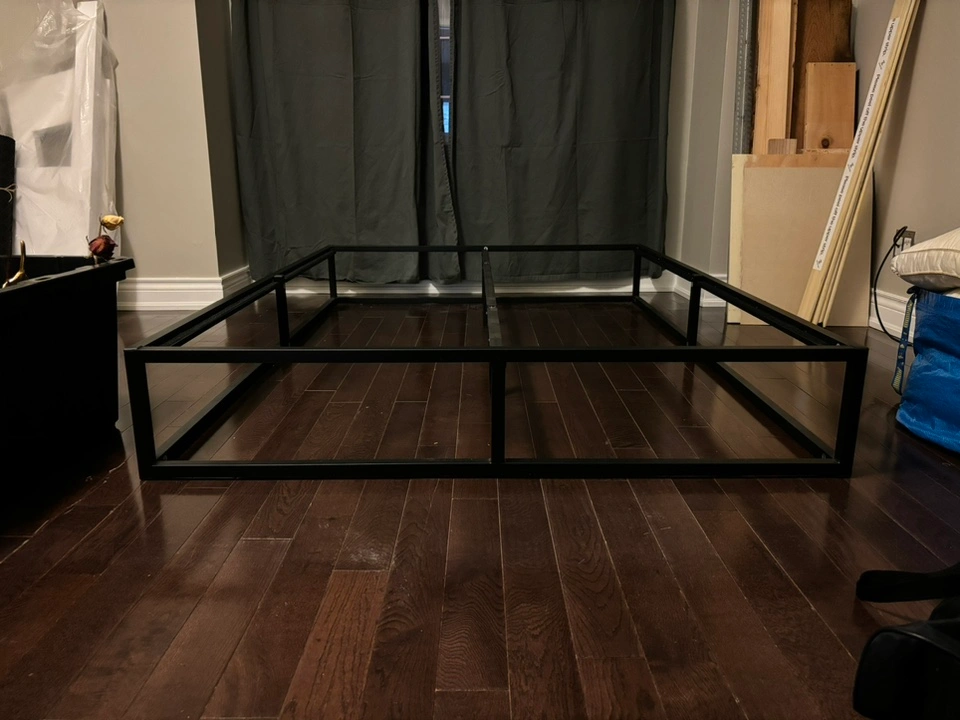 Black metal bed frame for a double/full size mattress. I unfortunately only have 4 slats as I was using plywood for a stronger base. You’ll need your own slats or plywood. Theres velcro lining the rails to hold them in place