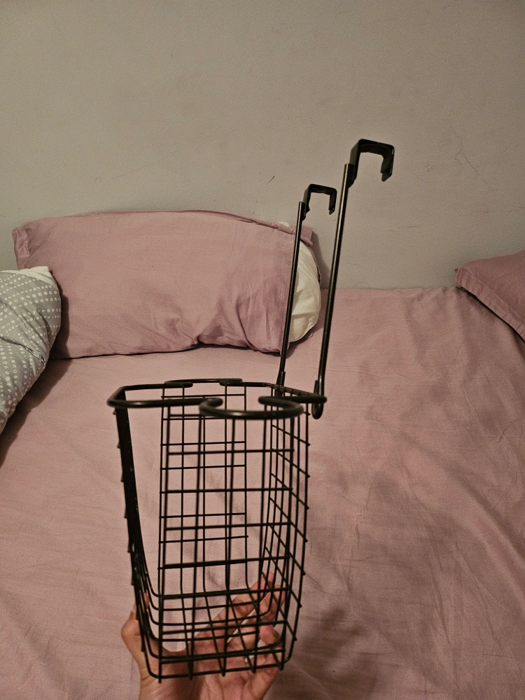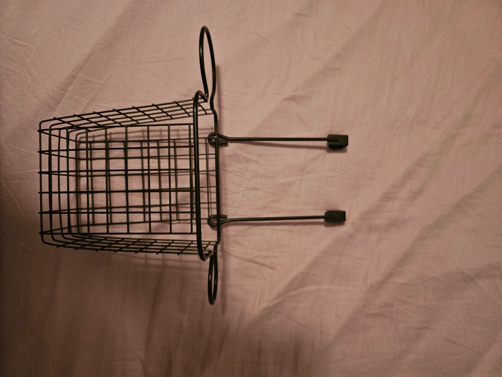 Wire hanging basket with two hooks that can be hung over a door. Great for storage in a bathroom, bedroom, or kitchen.