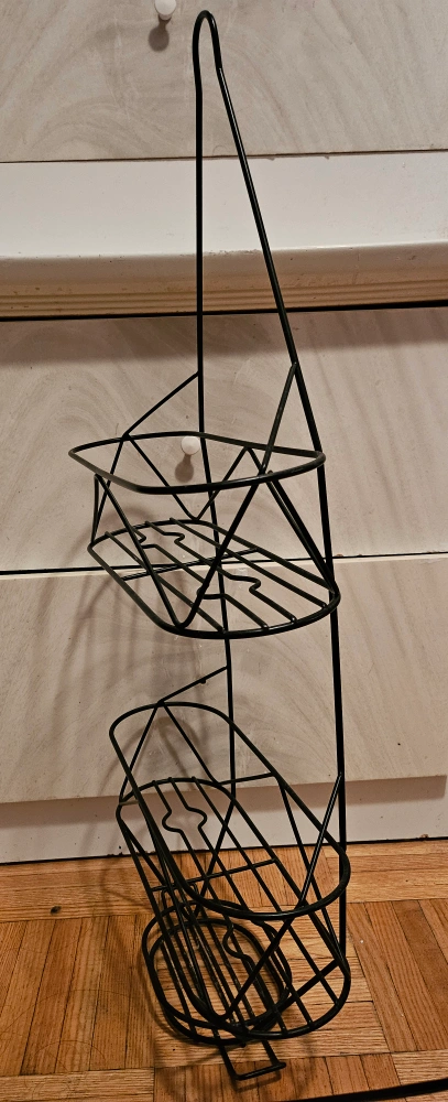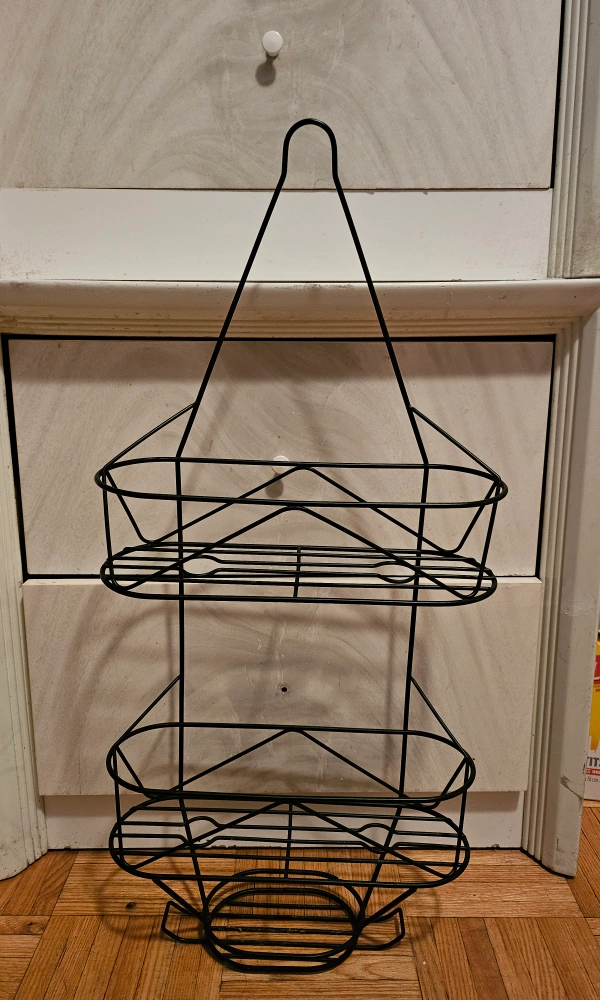 Two tier metal shower caddy. Great for holding shampoo, conditioner, body wash, razors, and other bathroom necessities.