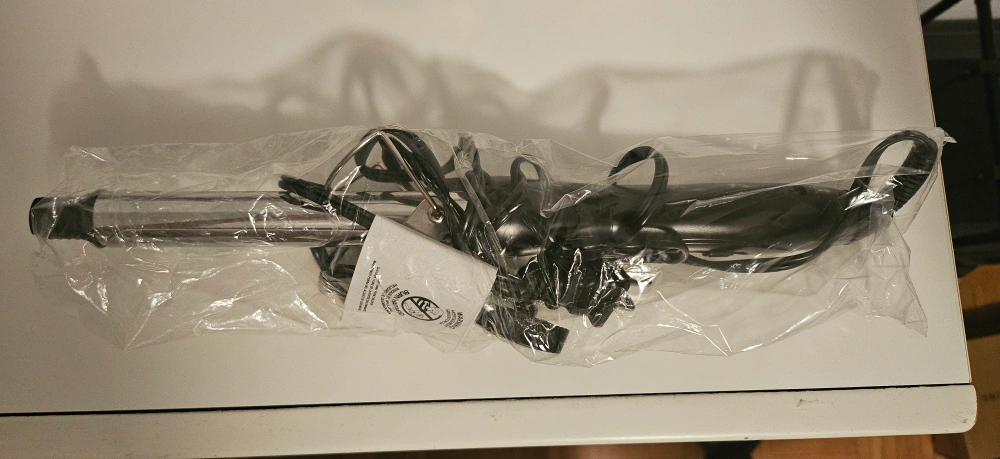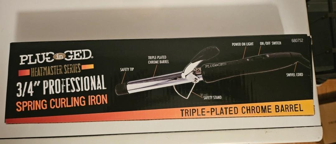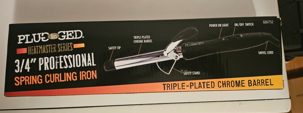 This curling iron is in the original packaging. It has a triple-plated chrome barrel, a safety tip, a safety stand, and a swivel cord.