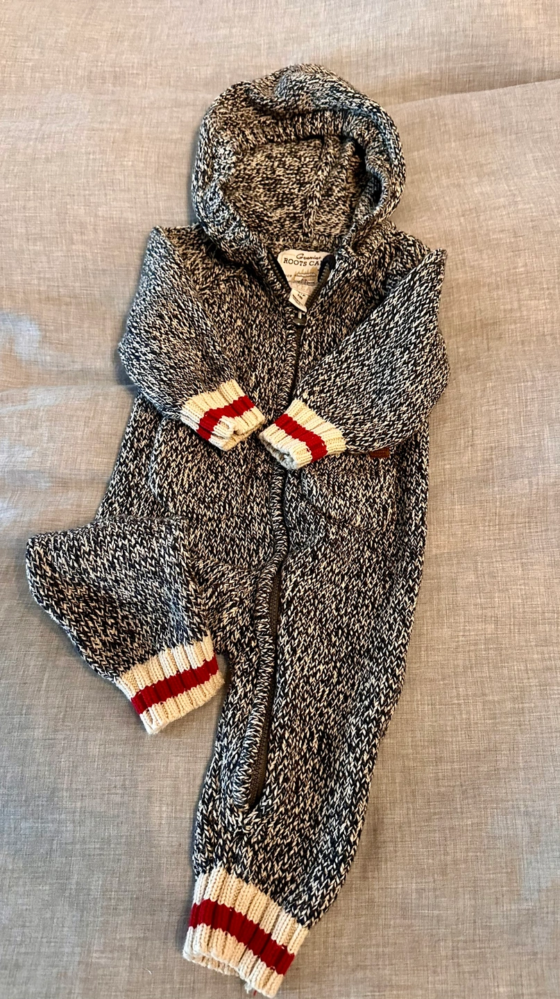 This Roots Canada knitted jumpsuit is a cozy and stylish option for any occasion. It features a zipper closure and a hood, making it perfect for keeping warm. The red and white accents add a touch of colour, making it a fun and playful piece.