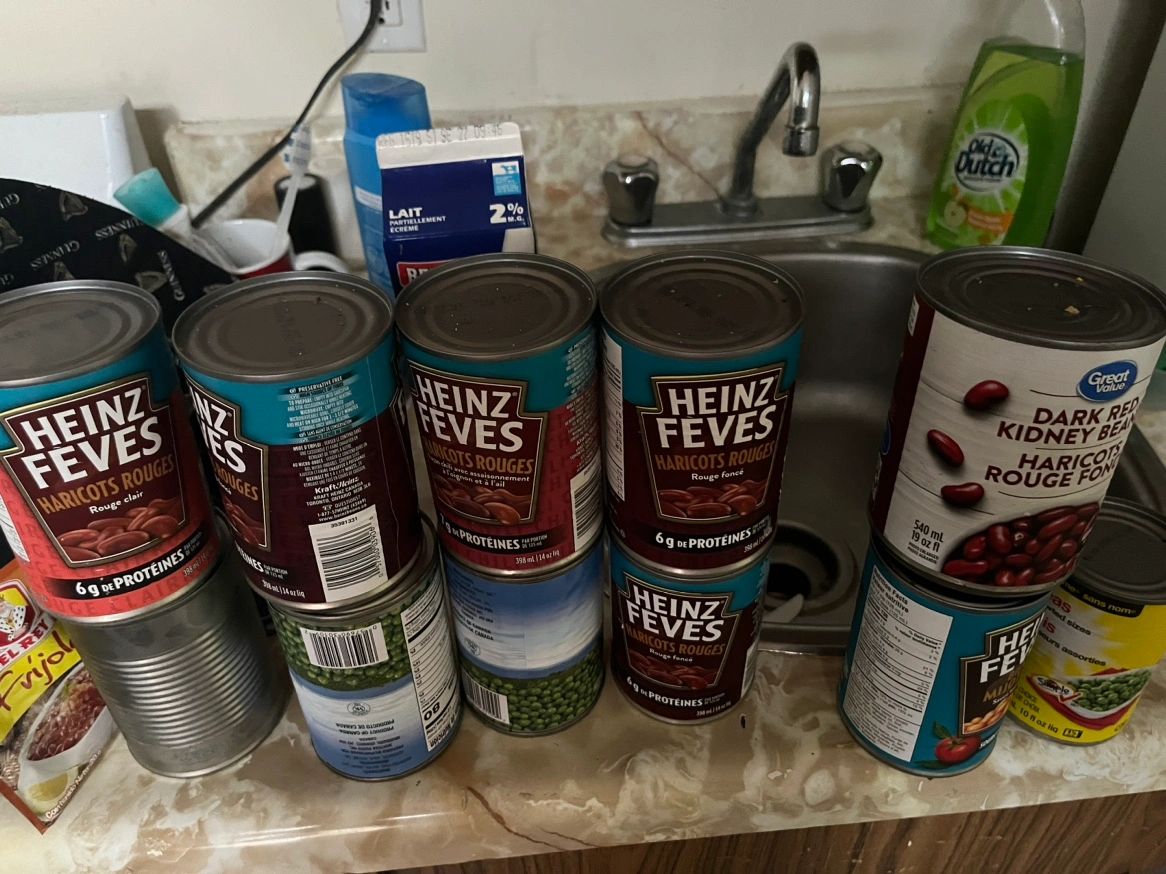 A stack of 10 cans of Heinz Feves Haricots Rouges. Some are red and some are darker red. There is also a can of Great Value Dark Red Kidney Beans and a can of Heinz Feves multi-coloured beans. Also peas