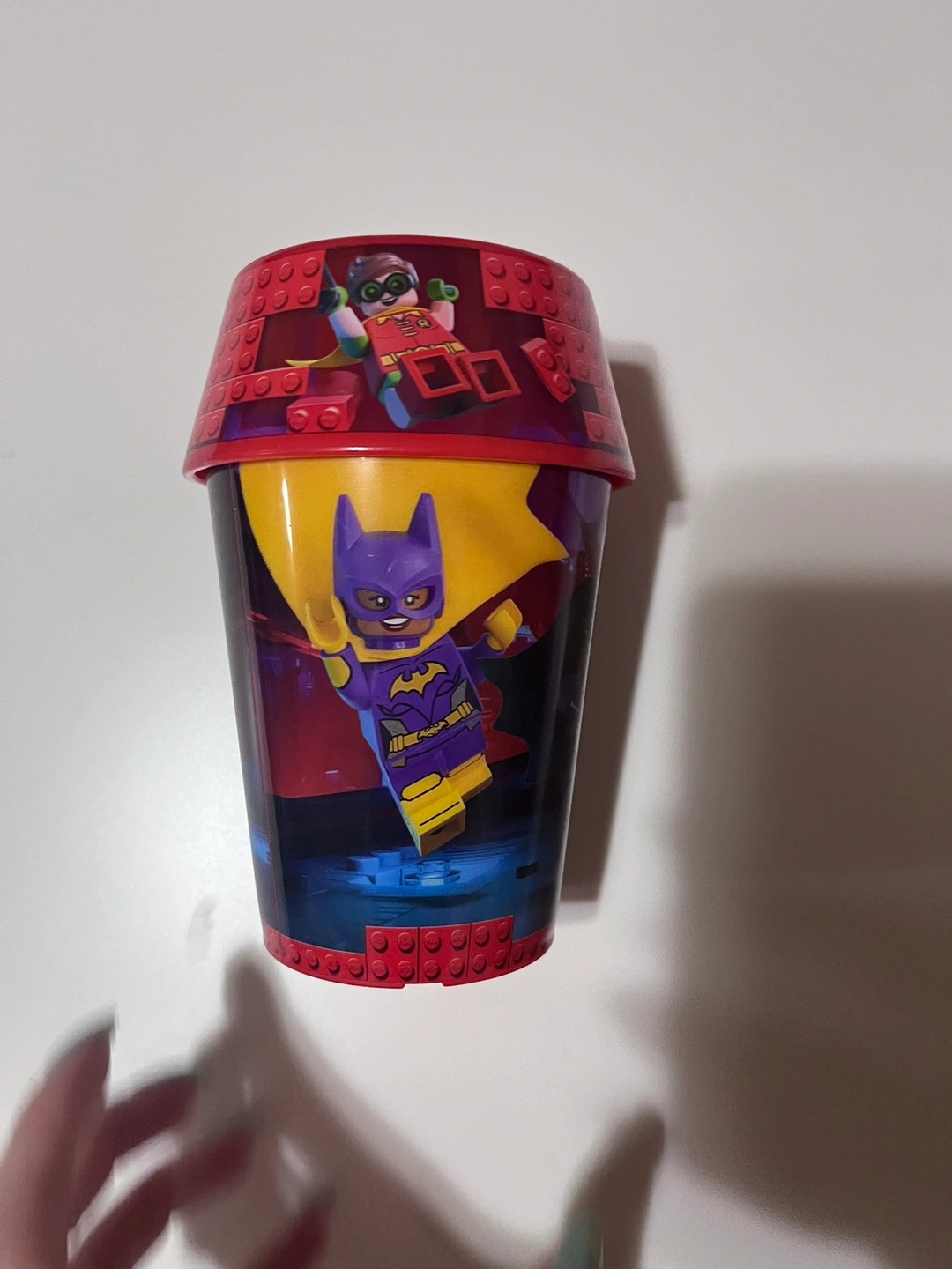 238A red plastic cup with a red lid featuring Lego Batman characters. The cup is approximately 10 cm tall.
