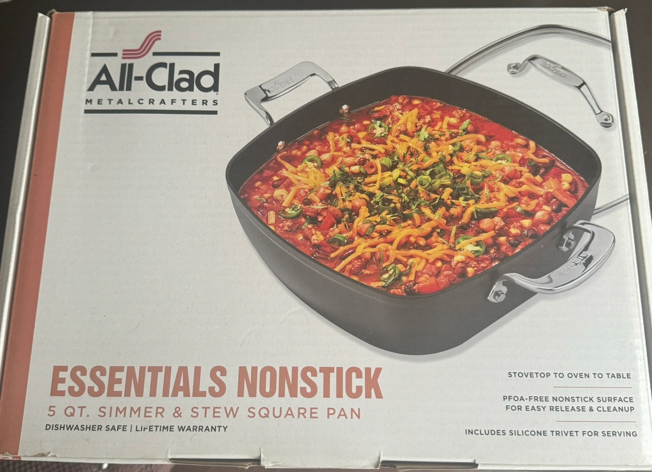 This All-Clad Essentials 5 Qt. Simmer & Stew Square Pan is a great addition to any kitchen. It features a PFOA-free nonstick surface for easy release and cleanup. The pan is dishwasher safe and comes with a silicone trivet for serving. It is also oven-safe, making it perfect for stovetop to oven cooking.