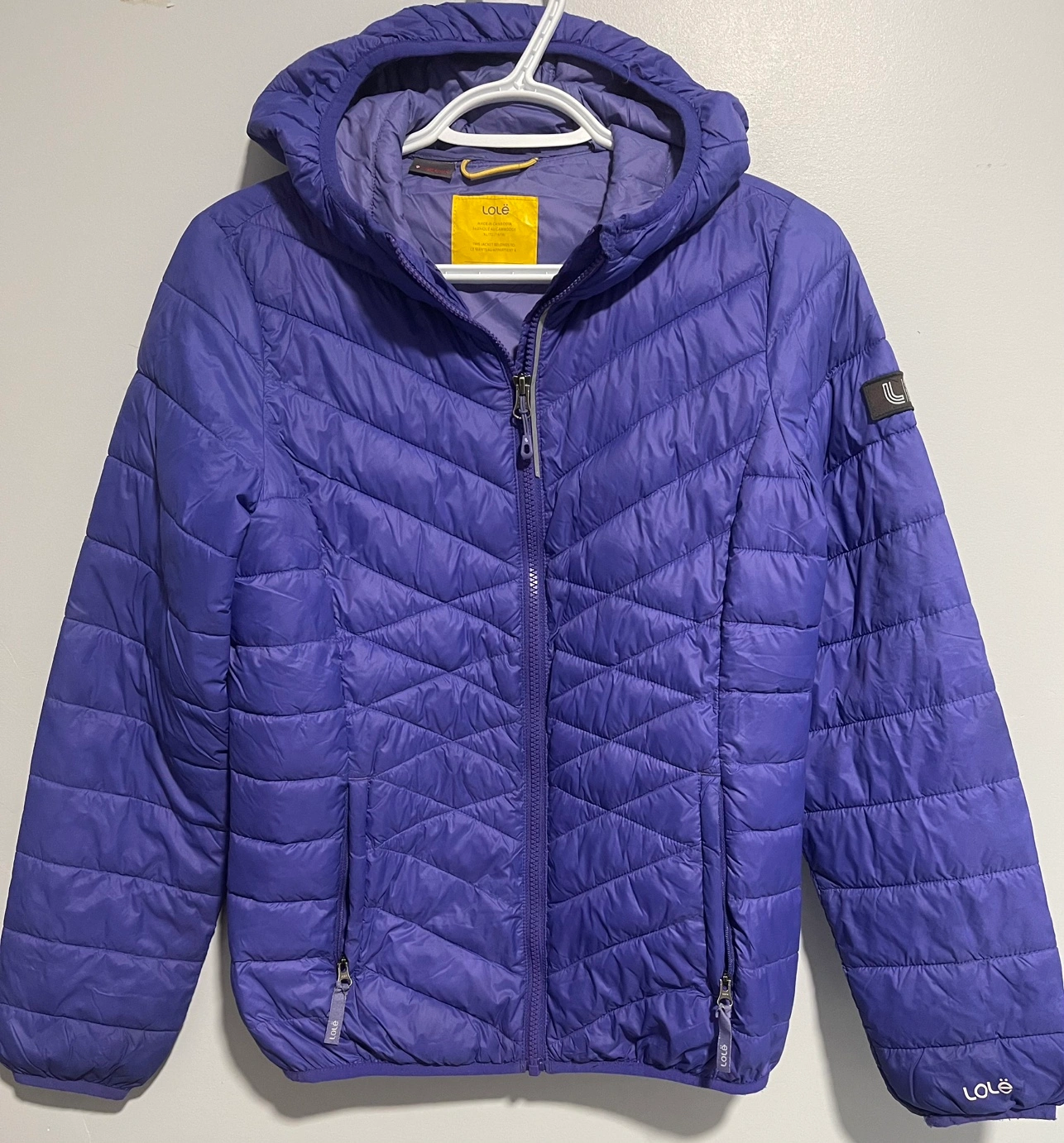 This is a purple puffer jacket from Lolë, with a hood, two front pockets, and a zipper closure. It also has a small Lole logo patch on the left sleeve.