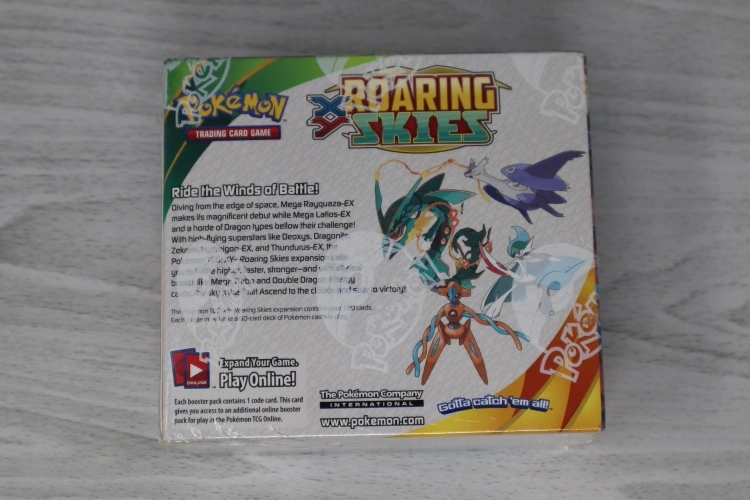 Diving from the edge of space, Mega Rayquaza-EX makes its magnificent debut while Mega Latios-EX and a horde of Dragon types bellow their challenge! With high-flying superstars like Deoxys, Dragonite, Zekrom, Hydreigon-EX, and Thundurus-EX, the Pokémon TCG: XY—Roaring Skies expansion calls you to battle higher, faster, stronger—and with all-new boosts like Mega Turbo and Double Dragon Energy cards, the sky’s the limit! Ascend to the clouds and soar to victory!The Pokémon TCG: XY—Roaring Skies expansion contains over 100 cards. Each player must have a 60-card deck of Pokémon cards to play.
