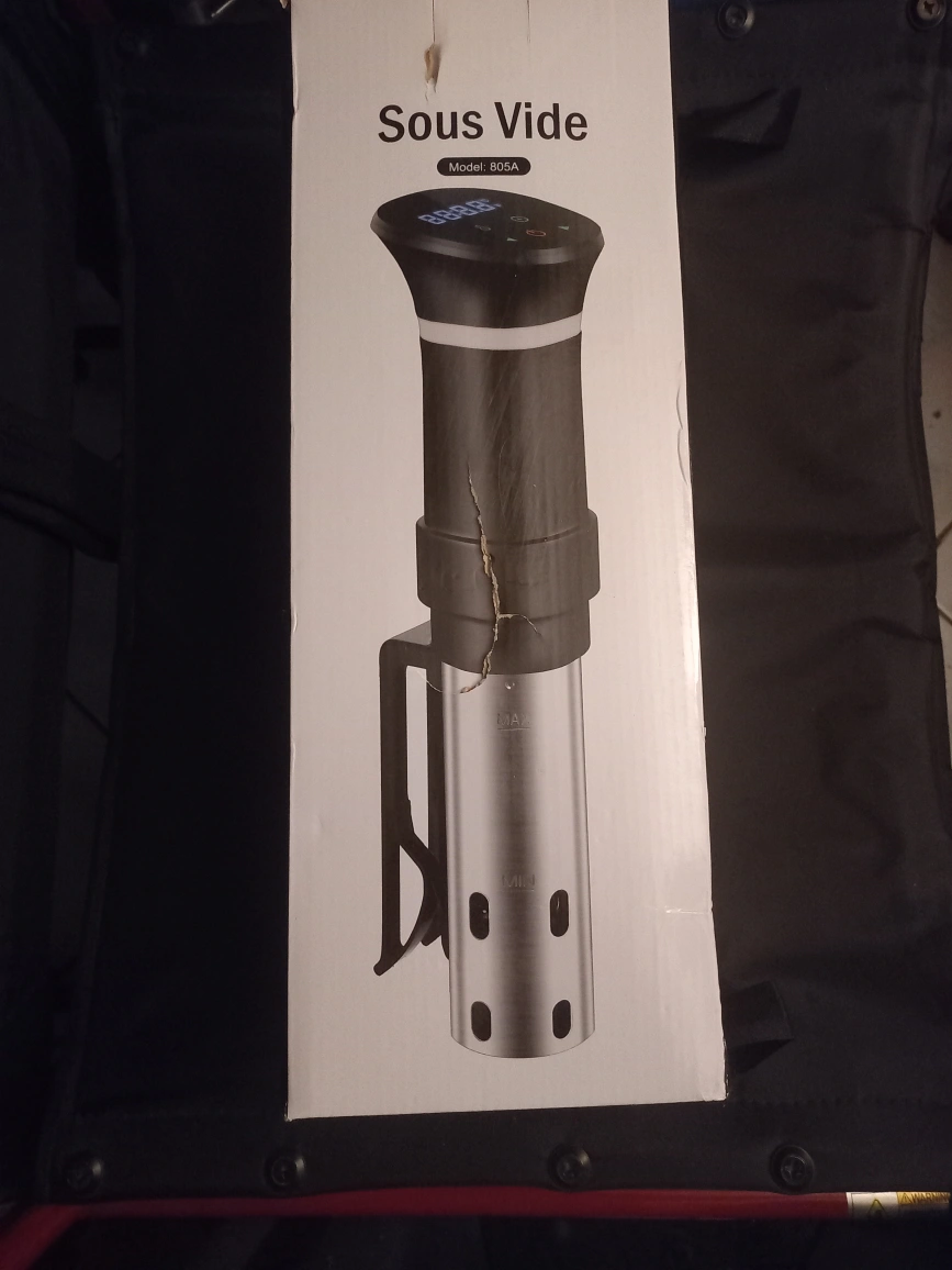 A black Sous Vide immersion cooker with a digital display. It has a clip to attach it to a pot or container. The device is in its original box.