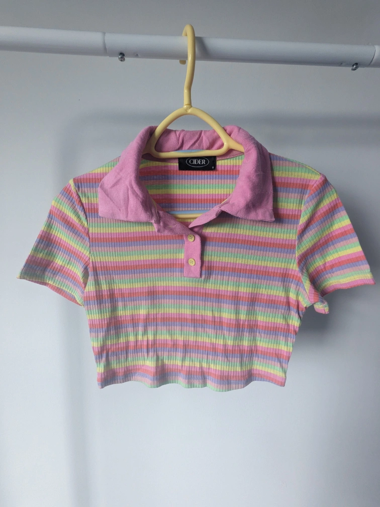 Short-sleeved, rainbow striped crop top with a collar and button closure.