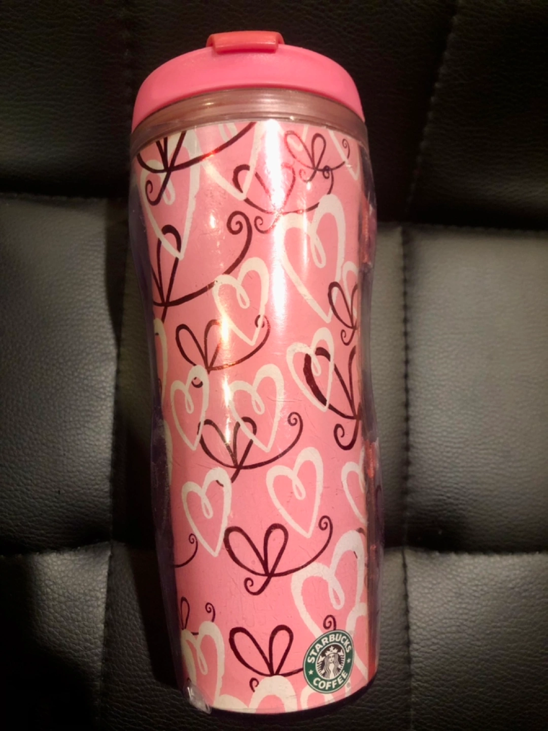 This pretty pink tumbler has served me well over the years but my clutzy tendencies can’t help but drop it all the time…(see cracked spot in the second pic). Only one outer plastic layer is cracked so liquids won’t actually leak through.