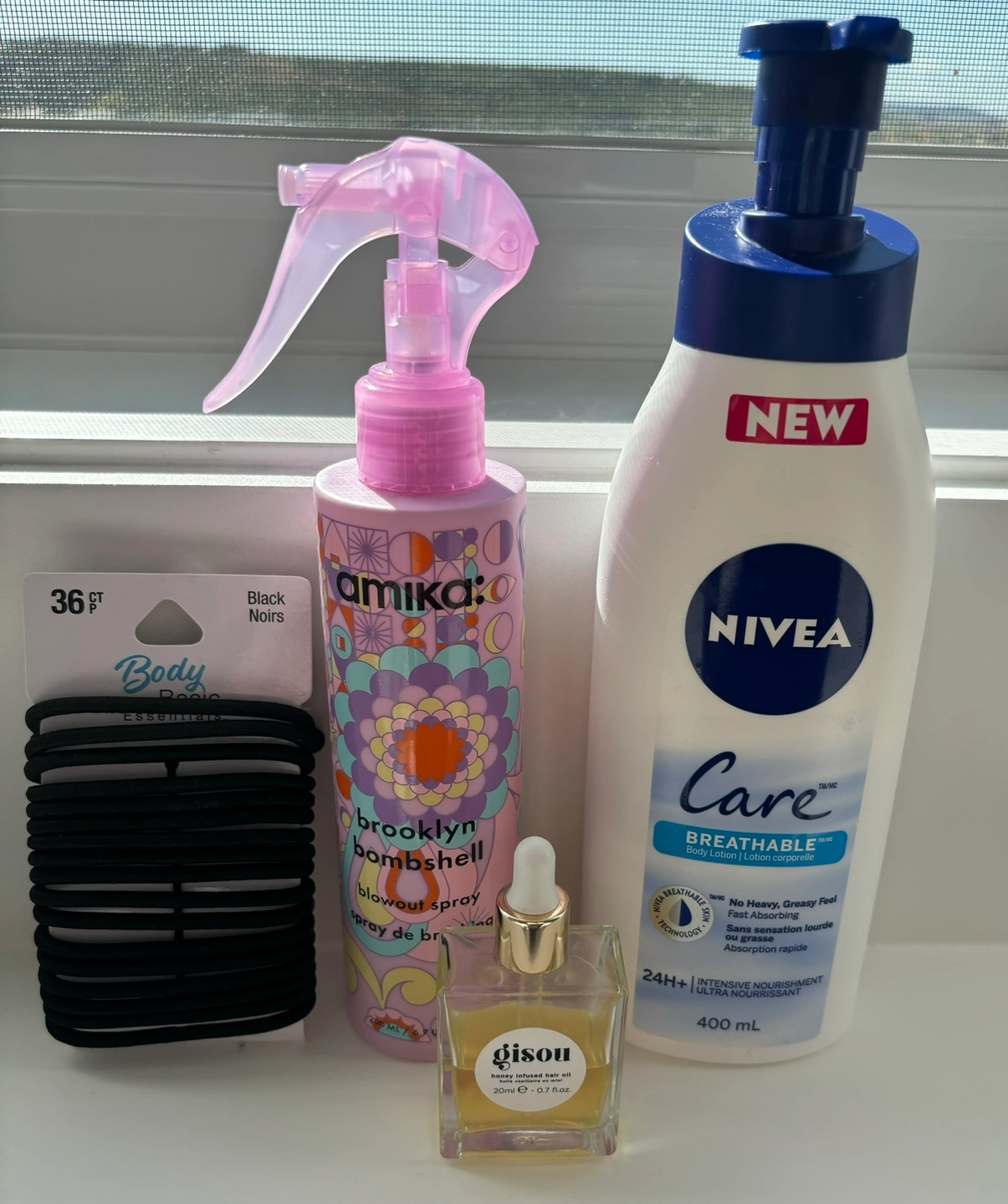 This bundle includes an Amika Brooklyn Bombshell blow out spray, a Gisou honey infused hair oil, black hair ties, and a new Nivea Care body lotion. All opened but still a good amount to use.