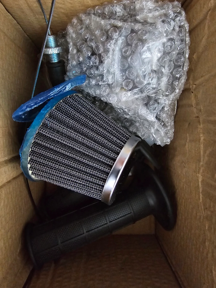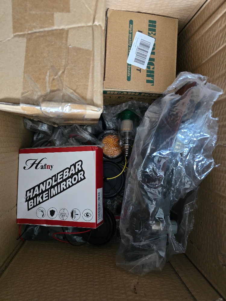 A box of car, bike and motorcycle parts, including a headlight, handlebar mirror, air filter, turn signals, full radio interface and more. All valued at $400+. Given it out at $90 beause i bought it in a lot.