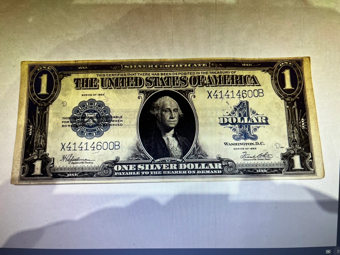 1923 $1 “Horse Blanket “ Blue Seal , Silver Certificate, one dollar bill with serial number X41414600B.