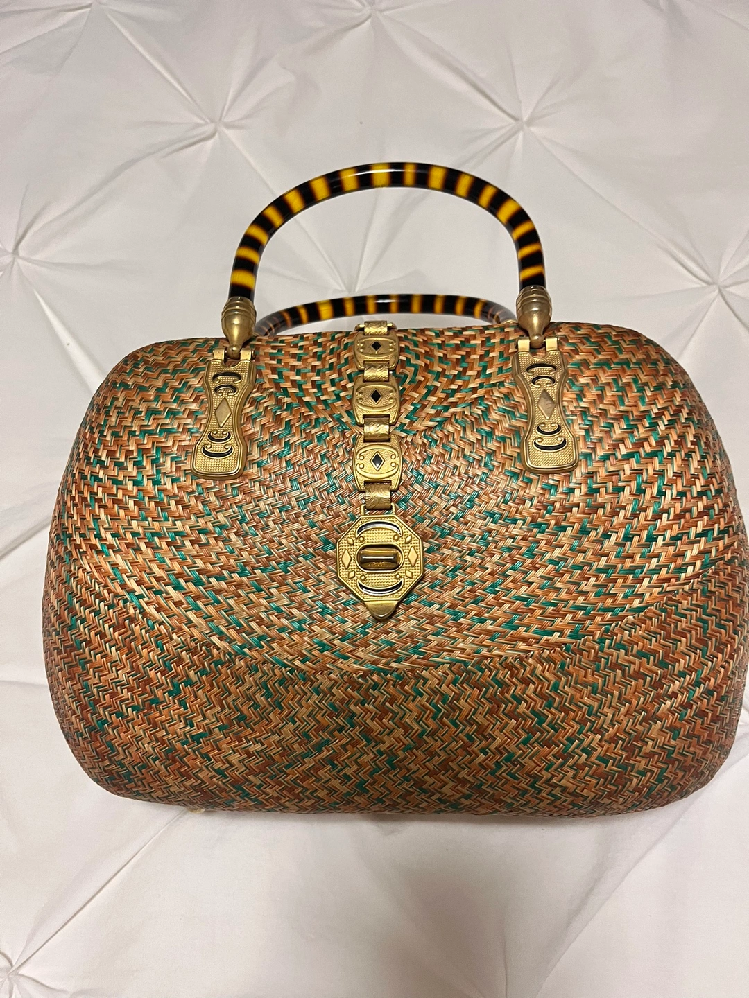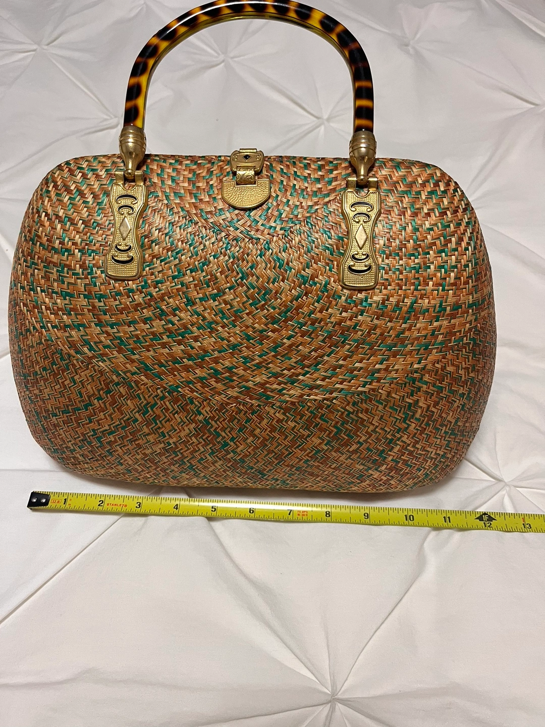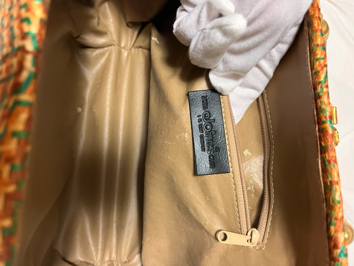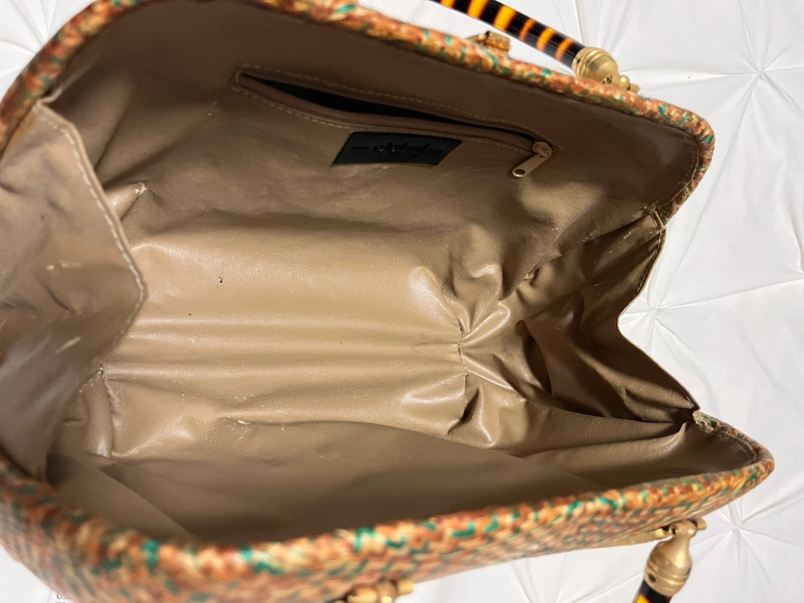A vintage woven Rattan handbag with a golden hardware decoration . The bag has a woven pattern and a lined interior. However only inside of the handbag is some parts worn out due to its age. The bag measures approximately 8 inches in length, 6.5 inches in width, and 5 inches in height.