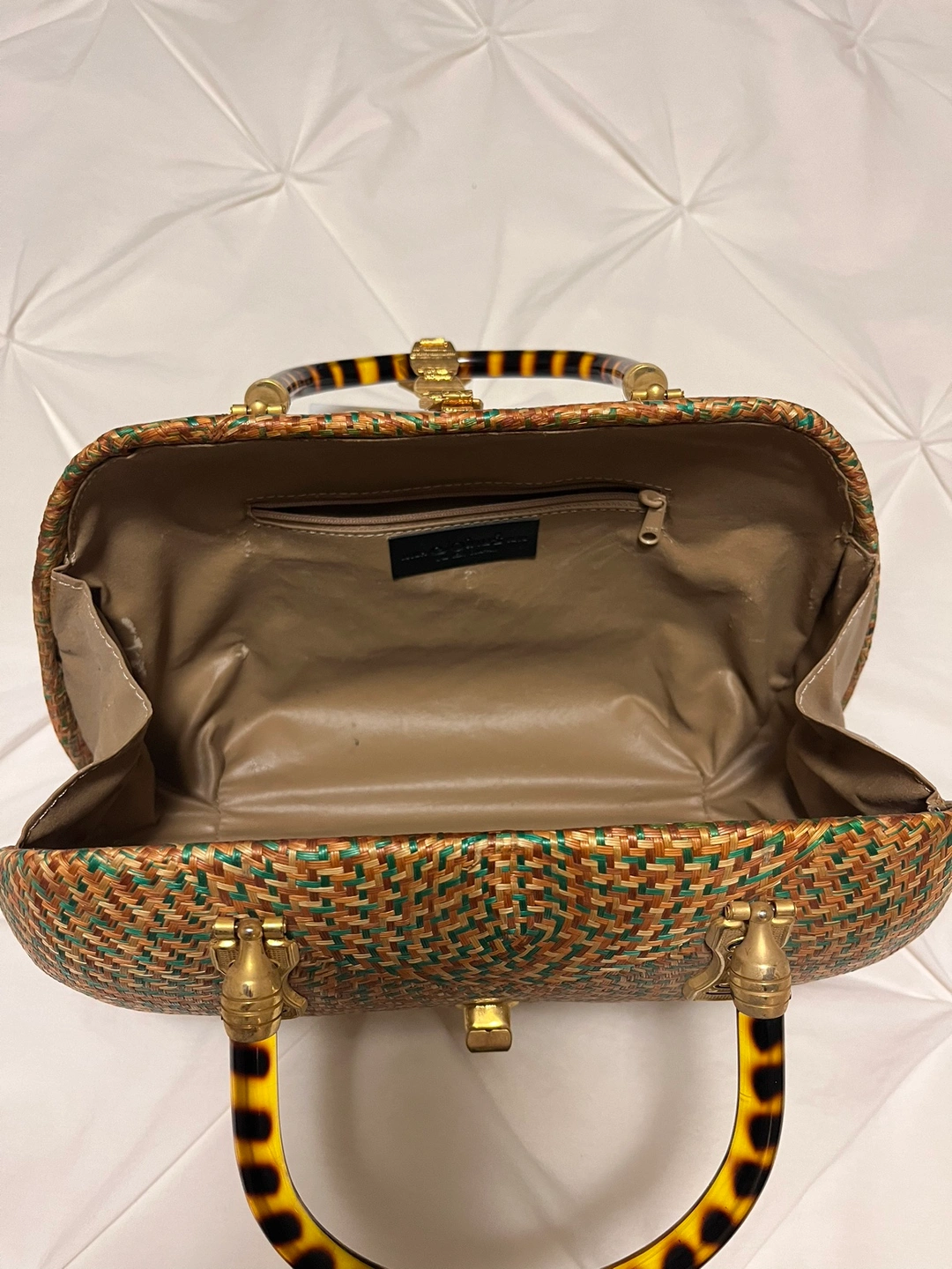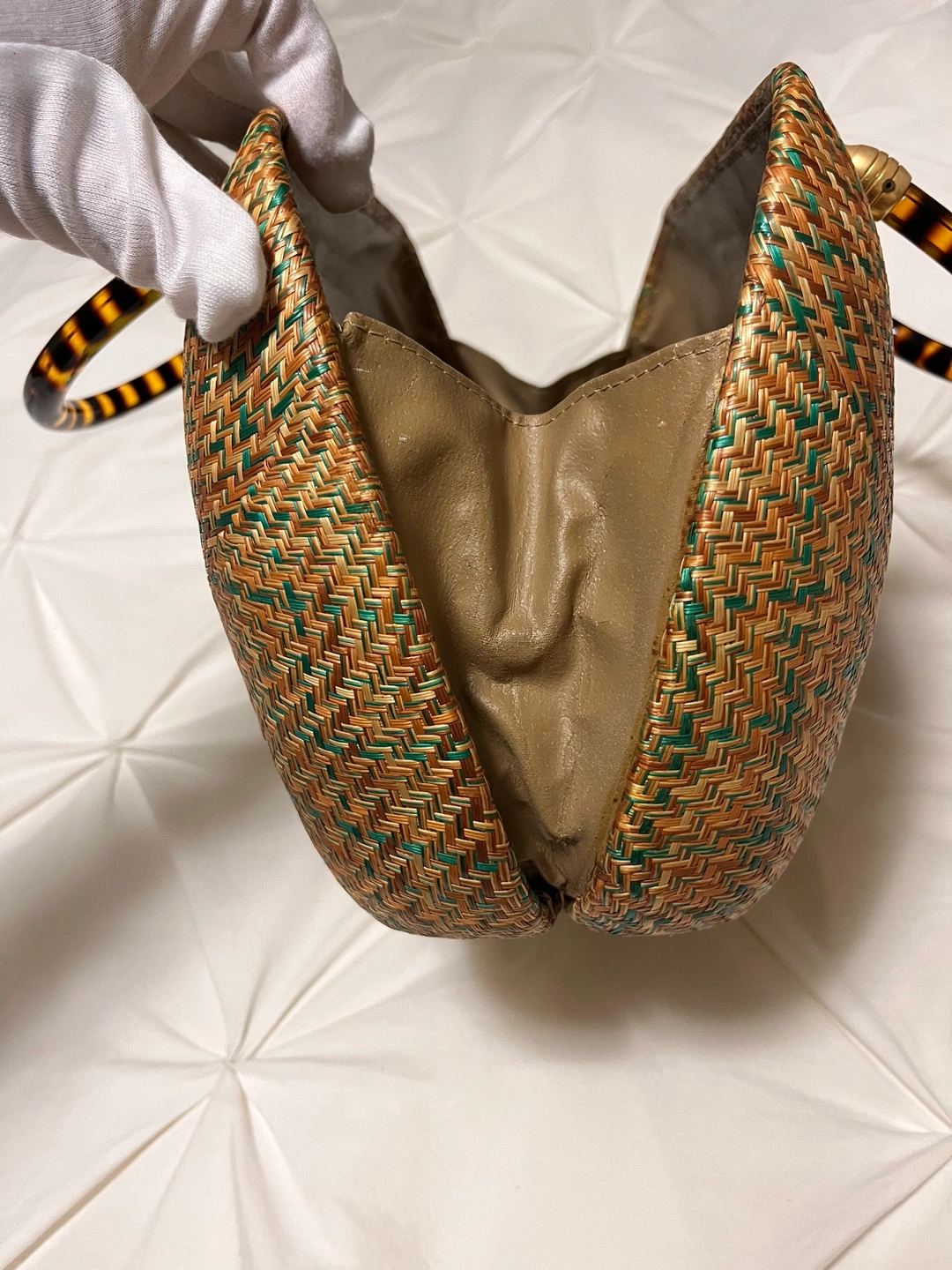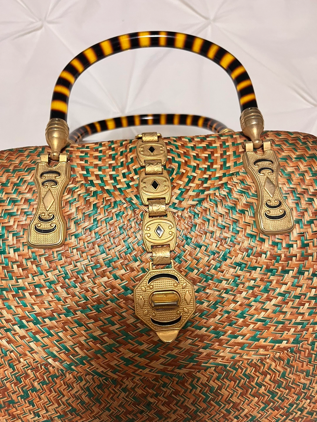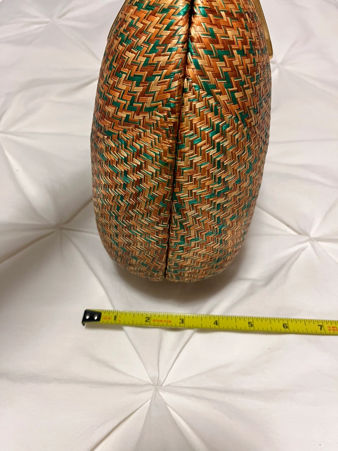 A vintage woven Rattan handbag with a golden hardware decoration . The bag has a woven pattern and a lined interior. However only inside of the handbag is some parts worn out due to its age. The bag measures approximately 8 inches in length, 6.5 inches in width, and 5 inches in height.