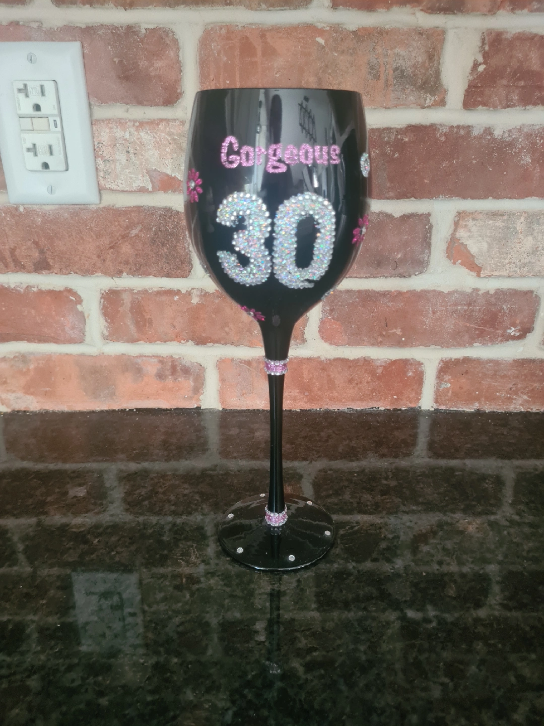 Here's a fun wine glass, perfect for celebrating a 30th birthday! It's black with 'Gorgeous' and '30' in sparkly letters