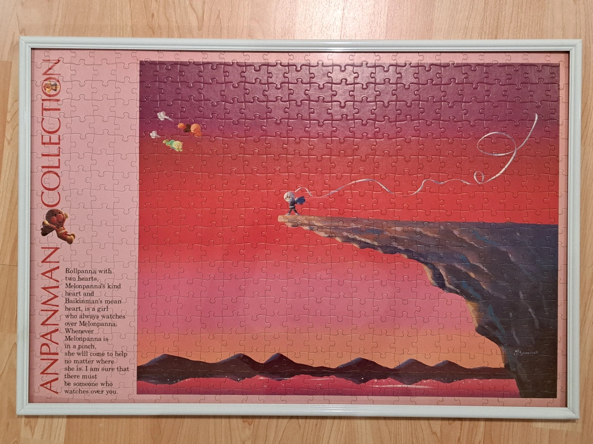 570Completed Anpanman jigsaw puzzle. Framed. Features Anpanman characters and artwork. Includes text describing the characters.