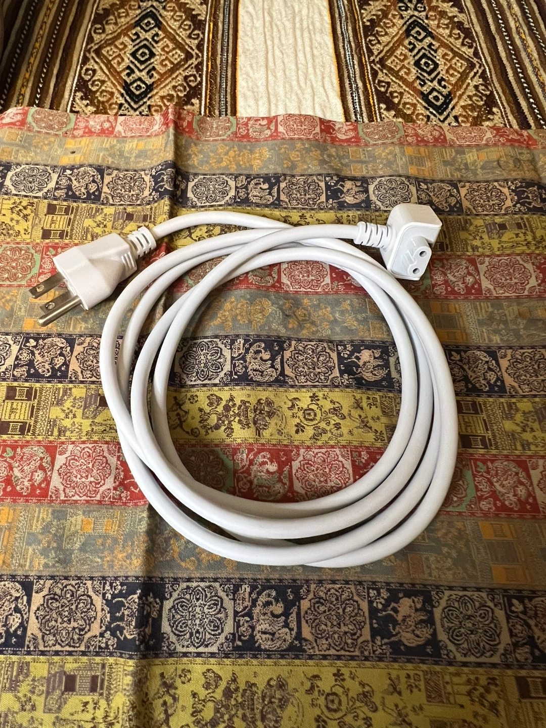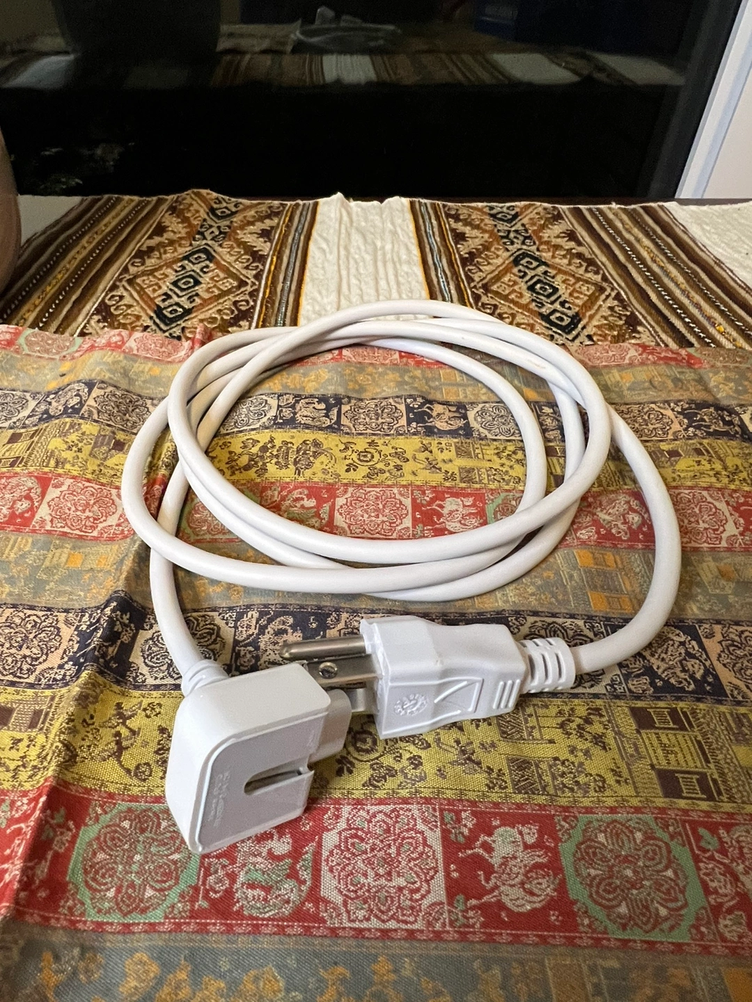A white power cord. The cord has a standard North American plug on one end and a European plug on the other end.