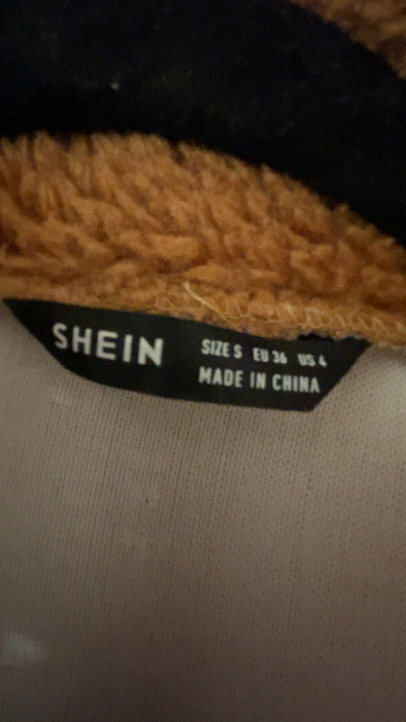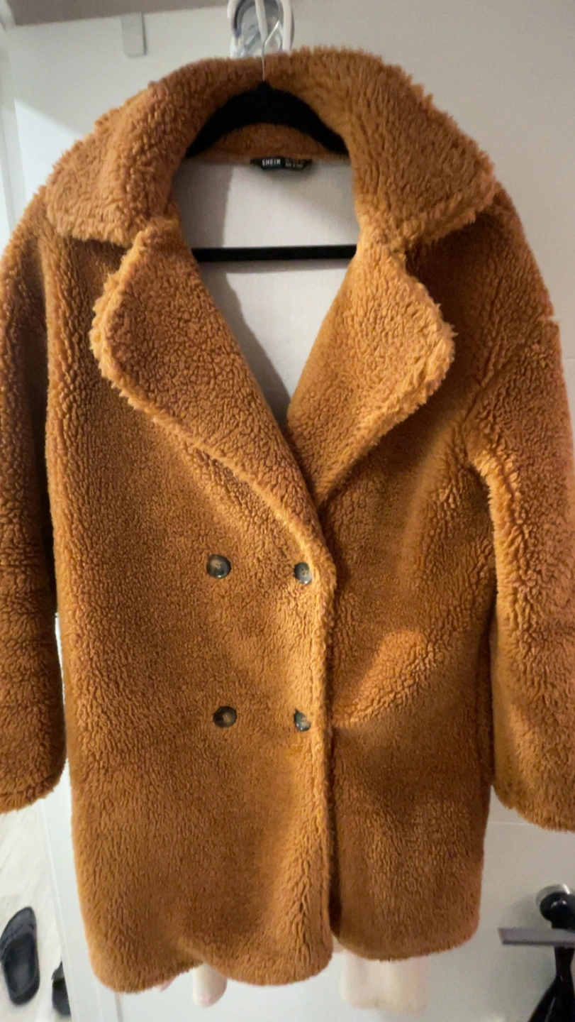 A brown teddy coat from SHEIN. The coat has a double breasted closure and a collar. It is size small but fits more like a medium.