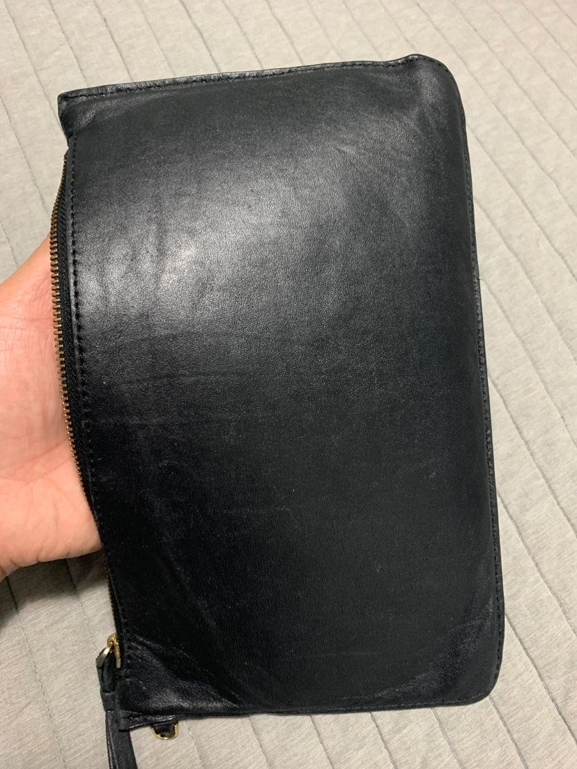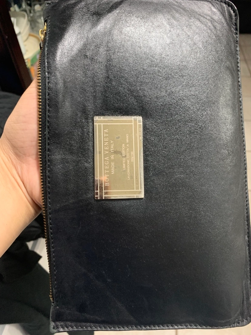 Black leather clutch with a gold zipper. The clutch has a metal Bottega Veneta tag on the front. It is a limited edition piece. It is made in Italy. The clutch has one main compartment. It comes with a wrist strap. The clutch is approximately 10.5 inches long, 6 inches wide, and 2 inches thick. The clutch is in good condition with minor signs of wear. The clutch is perfect for evening wear or special occasions. The clutch is a great way to add a touch of luxury to any outfit.