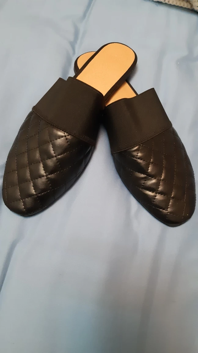 These are a pair of black quilted mules. They are made of a soft, quilted material and have a comfortable fit. They are great for everyday wear.